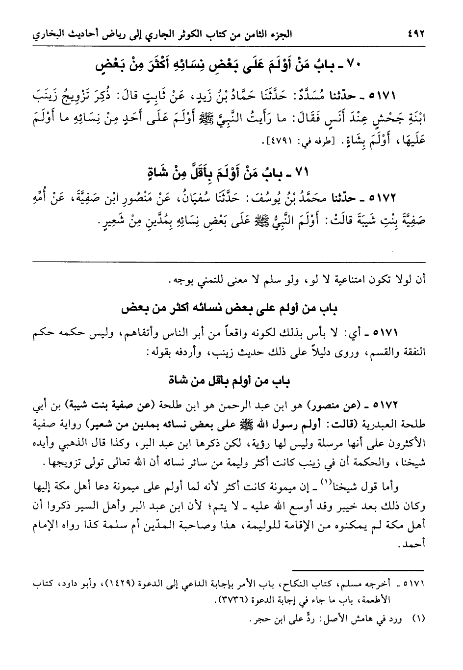 5172 - حَدَّثَنَا مُحَمَّدُ بْنُ يُوسُفَ حَدَّثَنَا سُفْيَانُ عَنْ مَنْصُورِ ابْنِ صَفِيَّةَ عَنْ أُمِّهِ صَفِيَّةَ بِنْتِ شَيْبَةَ قَالَتْ أَوْلَمَ النَّبِىُّ - صلى الله عليه وسلم - عَلَى بَعْضِ نِسَائِهِ بِمُدَّيْنِ مِنْ شَعِيرٍ.