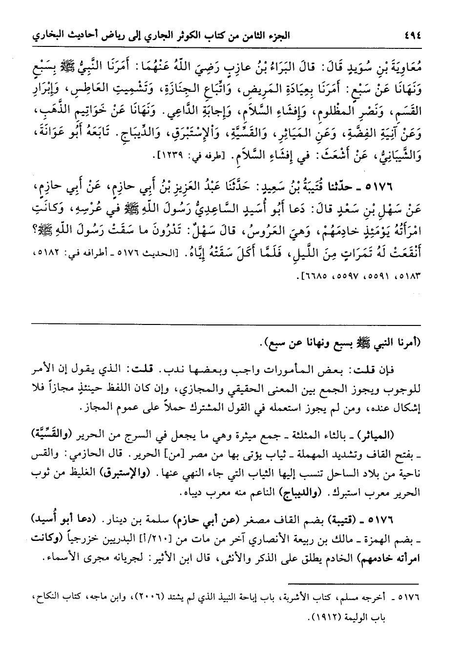 (المياثر) -بالثاء المثلثة- جمع ميثرة وهي ما يجعل في السرج من الحرير (والقَسِّيَّة) -بفتح القاف وتشديد المهملة- ثياب يؤتى بها من مصر [من] الحرير. قال الحازمي: والقس ناحية من بلاد الساحل تنسب إليها الثياب التي جاء النهي عنها. (والاستبرق) الغليظ من ثوب الحرير معرب استبرك. (والديباج) الناعم منه معرب ديباه.