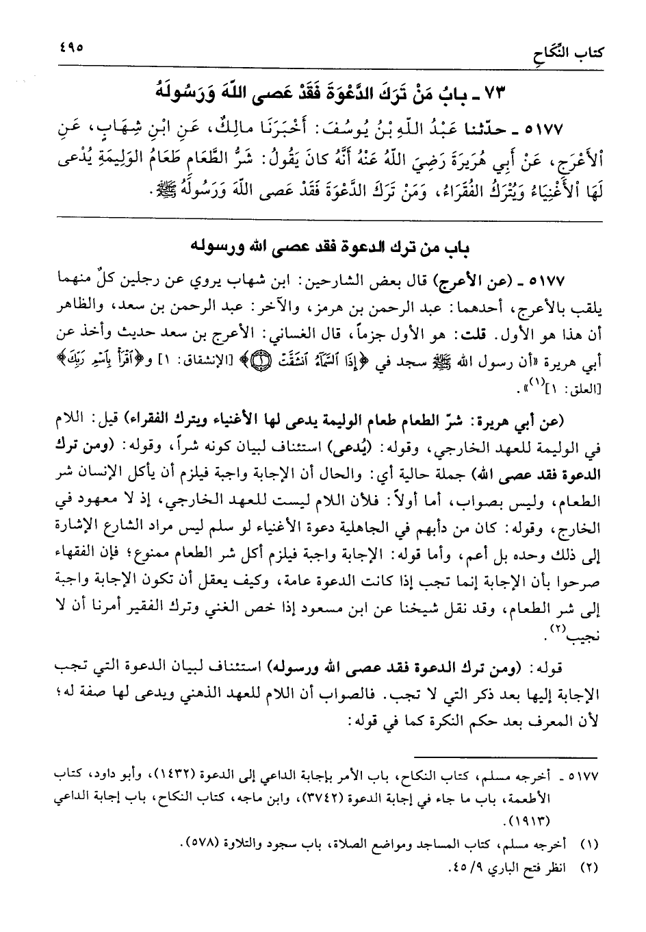 73 - باب مَنْ تَرَكَ الدَّعْوَةَ فَقَدْ عَصَى اللَّهَ وَرَسُولَهُ