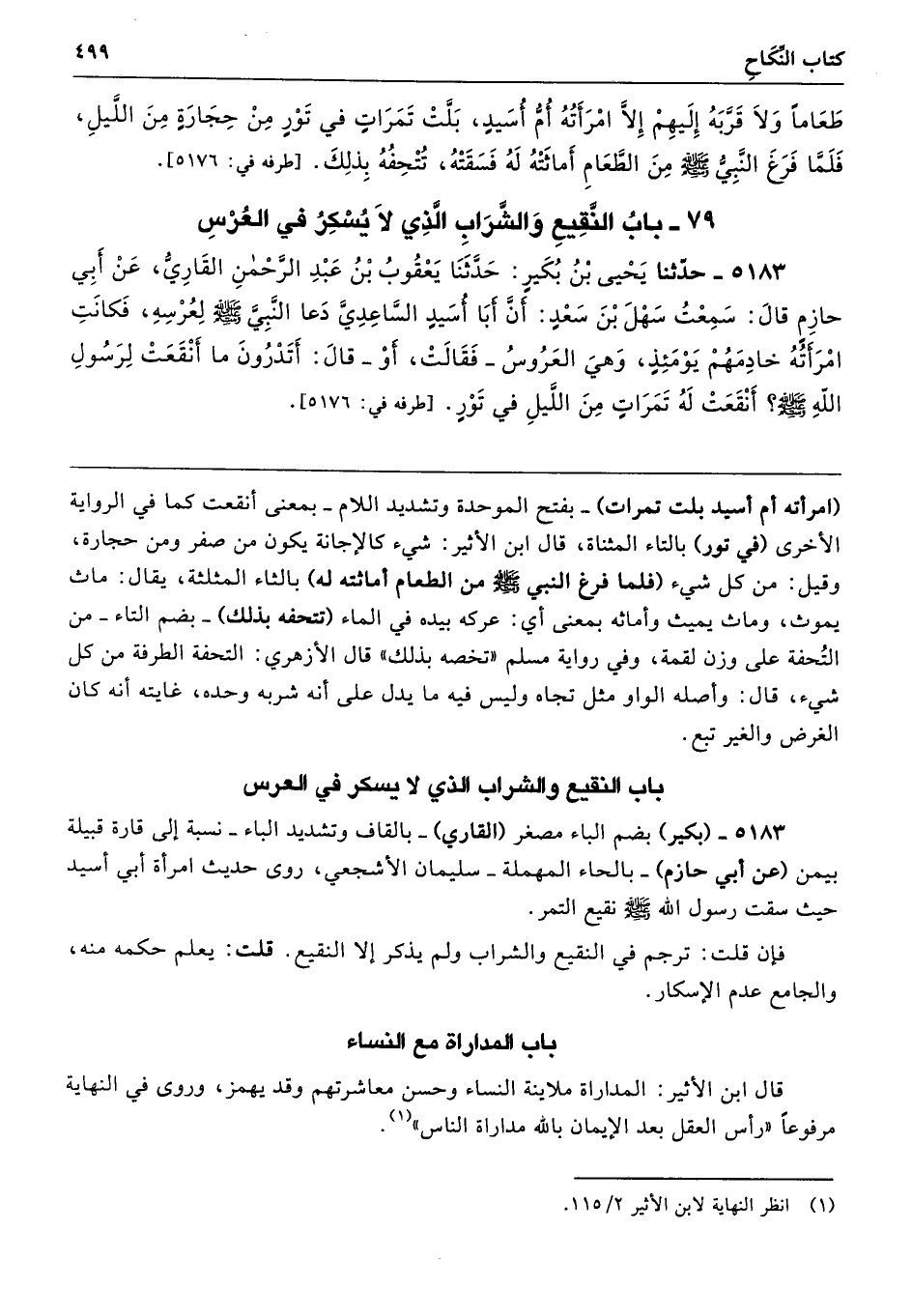 5183 - حَدَّثَنَا يَحْيَى بْنُ بُكَيْرٍ حَدَّثَنَا يَعْقُوبُ بْنُ عَبْدِ الرَّحْمَنِ الْقَارِىُّ عَنْ أَبِى حَازِمٍ قَالَ سَمِعْتُ سَهْلَ بْنَ سَعْدٍ أَنَّ أَبَا أُسَيْدٍ السَّاعِدِىَّ دَعَا النَّبِىَّ - صلى الله عليه وسلم - لِعُرْسِهِ، فَكَانَتِ امْرَأَتُهُ خَادِمَهُمْ يَوْمَئِذٍ وَهْىَ الْعَرُوسُ، فَقَالَتْ أَوْ قَالَ أَتَدْرُونَ مَا أَنْقَعَتْ لِرَسُولِ اللَّهِ - صلى الله عليه وسلم - أَنْقَعَتْ لَهُ تَمَرَاتٍ مِنَ اللَّيْلِ فِي تَوْرٍ. طرفه 5176
