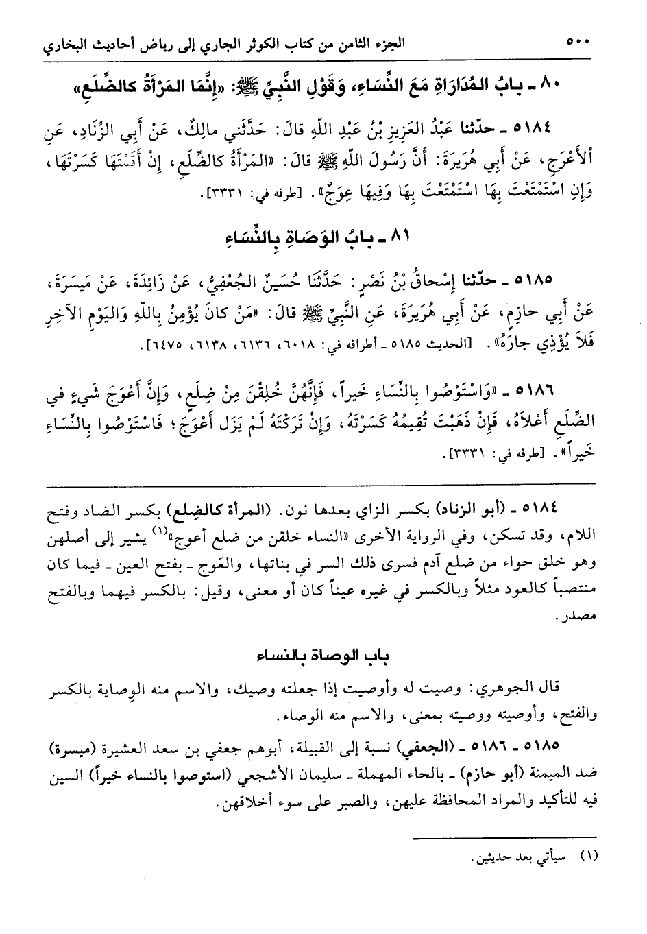 5185 - 5186 - (الجعفي) نسبة إلى القبيلة، أبوهم جعفي بن سعد العشيرة (ميسرة) ضد الميمنة (أبو حازم) -بالحاء المهملة- سليمان الأشجعي (استوصوا بالنساء خيرًا) السين فيه للتأكيد والمراد المحافظة عليهن، والصبر على سوء أخلاقهن.