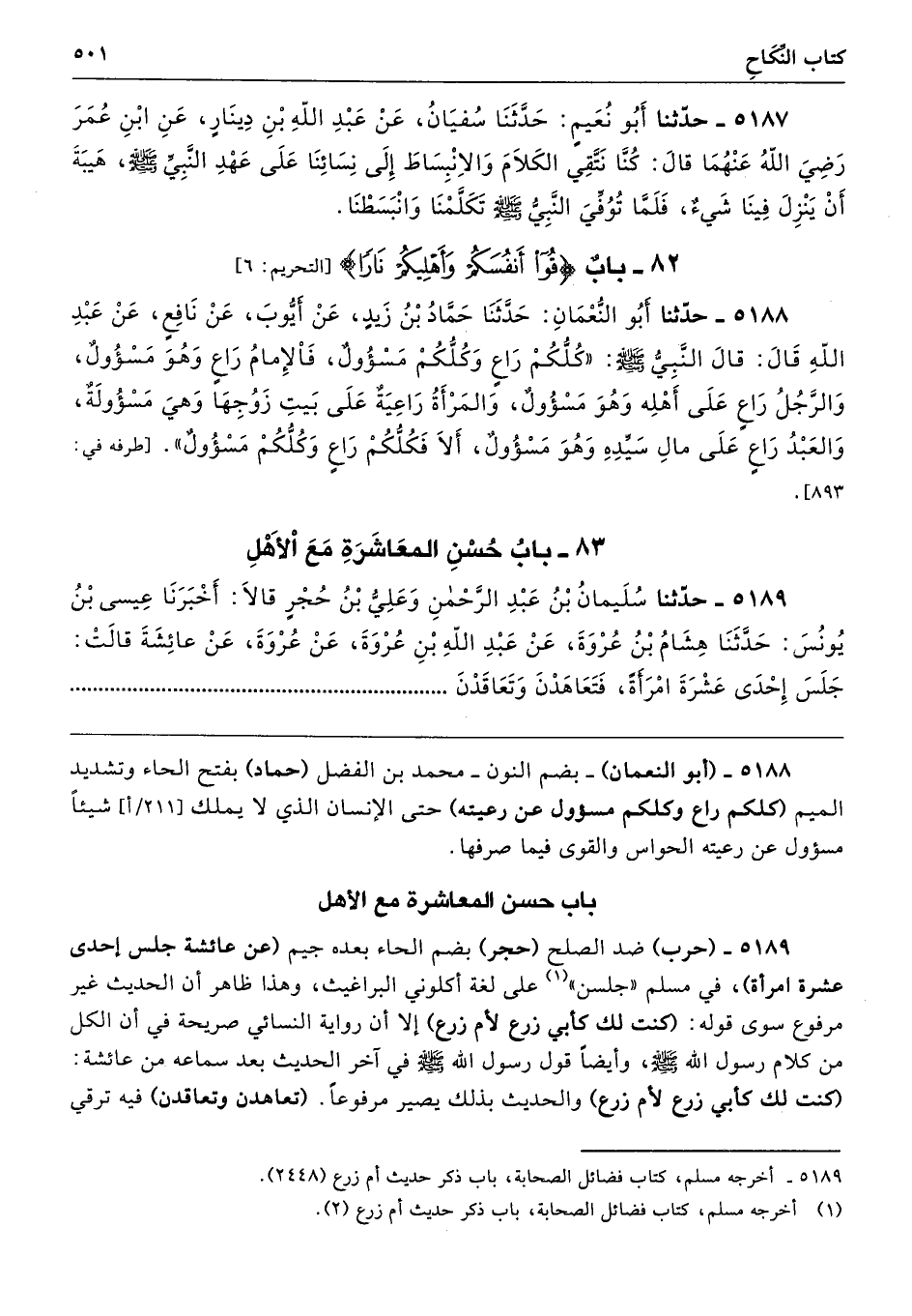5188 - (أبو النعمان) -بضم النون- محمد بن الفضل (حماد) بفتح الحاء وتشديد الميم كلكم راع وكلكم مسؤول عن رعيته) حتى الإنسان الذي لا يملك شيئًا مسؤول عن رعيته الحواس والقوى فيما صرفها.