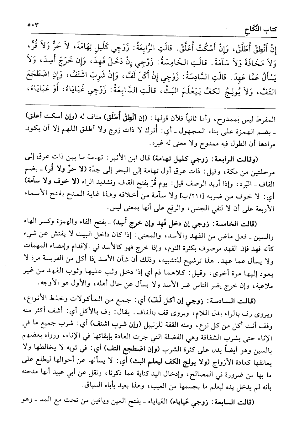إِنْ أَنْطِقْ أُطَلَّقْ وَإِنْ أَسْكُتْ أُعَلَّقْ. قَالَتِ الرَّابِعَةُ زَوْجِى كَلَيْلِ تِهَامَةَ، لاَ حَرٌّ، وَلاَ قُرٌّ، وَلاَ مَخَافَةَ، وَلاَ سَآمَةَ. قَالَتِ الْخَامِسَةُ زَوْجِى إِنْ دَخَلَ فَهِدَ، وَإِنْ خَرَجَ أَسِدَ، وَلاَ يَسْأَلُ عَمَّا عَهِدَ. قَالَتِ السَّادِسَةُ زَوْجِى إِنْ أَكَلَ لَفَّ، وَإِنْ شَرِبَ اشْتَفَّ، وَإِنِ اضْطَجَعَ الْتَفَّ، وَلاَ يُولِجُ الْكَفَّ لِيَعْلَمَ الْبَثَّ، قَالَتِ السَّابِعَةُ زَوْجِى غَيَايَاءُ أَوْ عَيَايَاءُ