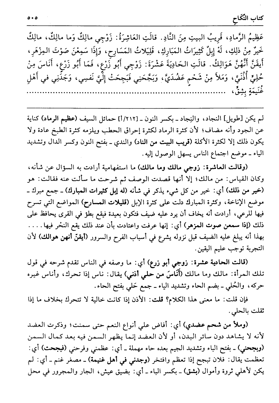 عَظِيمُ الرَّمَادِ، قَرِيبُ الْبَيْتِ مِنَ النَّادِ. قَالَتِ الْعَاشِرَةُ زَوْجِى مَالِكٌ وَمَا مَالِكٌ، مَالِكٌ خَيْرٌ مِنْ ذَلِكِ، لَهُ إِبِلٌ كَثِيرَاتُ الْمَبَارِكِ قَلِيلاَتُ الْمَسَارِحِ، وَإِذَا سَمِعْنَ صَوْتَ الْمِزْهَرِ أَيْقَنَّ أَنَّهُنَّ هَوَالِكُ. قَالَتِ الْحَادِيَةَ عَشْرَةَ زَوْجِى أَبُو زَرْعٍ فَمَا أَبُو زَرْعٍ أَنَاسَ مِنْ حُلِىٍّ أُذُنَىَّ، وَمَلأَ مِنْ شَحْمٍ عَضُدَىَّ، وَبَجَّحَنِى فَبَجِحَتْ إِلَىَّ نَفْسِى، وَجَدَنِى فِي أَهْلِ غُنَيْمَةٍ بِشِقٍّ،