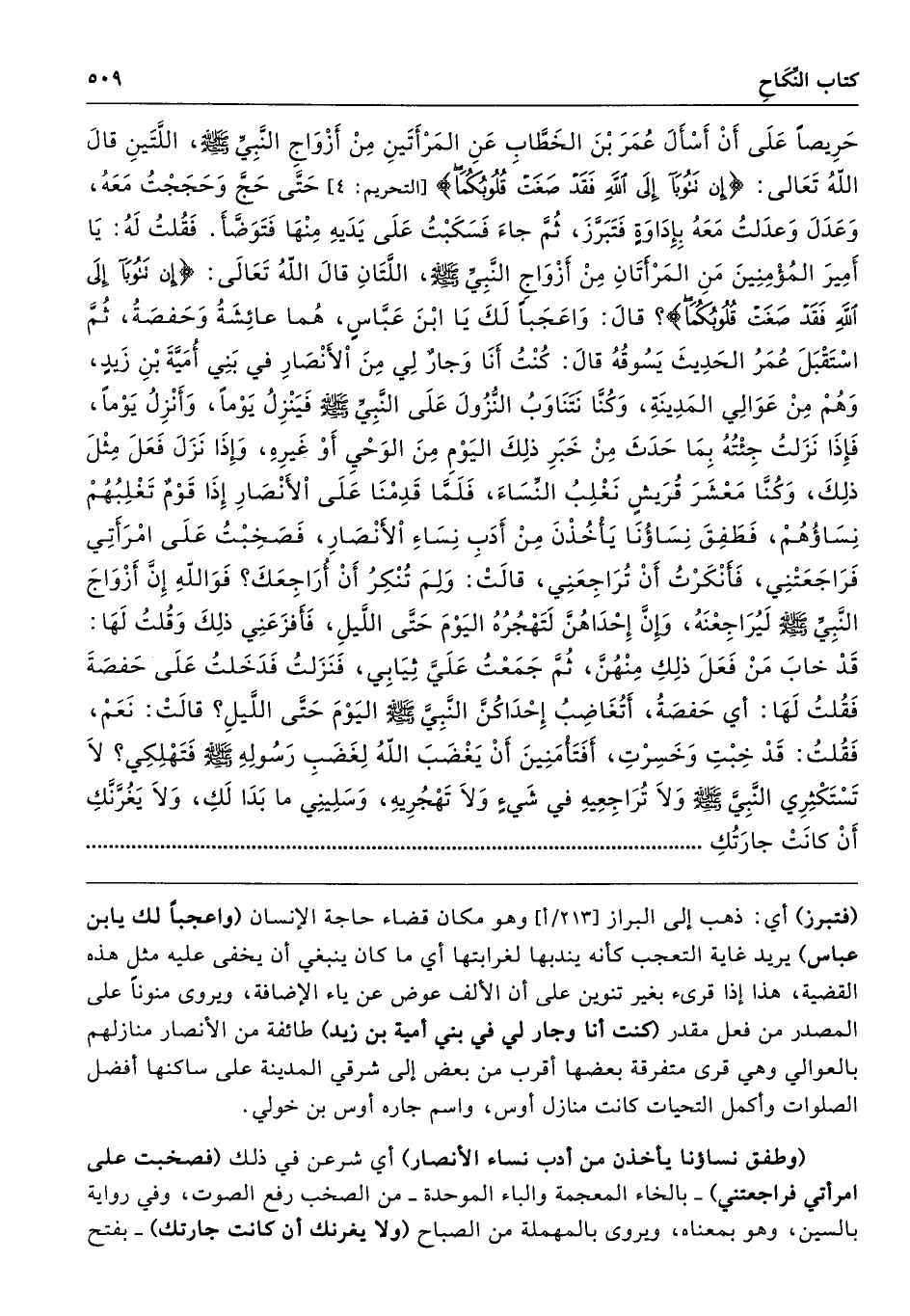 حَرِيصًا أَنْ أَسْأَلَ عُمَرَ بْنَ الْخَطَّابِ عَنِ الْمَرْأَتَيْنِ مِنْ أَزْوَاجِ النَّبِيِّ - صلى الله عليه وسلم - اللَّتَيْنِ قَالَ اللَّهُ تَعَالَى (إِنْ تَتُوبَا إِلَى اللَّهِ فَقَدْ صَغَتْ قُلُوبُكُمَا) حَتَّى حَجَّ وَحَجَجْتُ مَعَهُ، وَعَدَلَ وَعَدَلْتُ مَعَهُ بِإِدَاوَةٍ، فَتَبَرَّزَ، ثُمَّ جَاءَ فَسَكَبْتُ عَلَى يَدَيْهِ مِنْهَا فَتَوَضَّأَ فَقُلْتُ لَهُ يَا أَمِيرَ الْمُؤْمِنِينَ مَنِ الْمَرْأَتَانِ مِنْ أَزْوَاجِ النَّبِيِّ - صلى الله عليه وسلم - اللَّتَانِ قَالَ اللَّهُ تَعَالَى (إِنْ تَتُوبَا إِلَى اللَّهِ فَقَدْ صَغَتْ قُلُوبُكُمَا) قَالَ وَاعَجَبًا لَكَ يَا ابْنَ عَبَّاسٍ، هُمَا عَائِشَةُ وَحَفْصَةُ. ثُمَّ اسْتَقْبَلَ عُمَرُ الْحَدِيثَ يَسُوقُهُ قَالَ كُنْتُ أَنَا وَجَارٌ لِى مِنَ الأَنْصَارِ فِي بَنِى أُمَيَّةَ بْنِ زَيْدٍ، وَهُمْ مِنْ عَوَالِى الْمَدِينَةِ، وَكُنَّا نَتَنَاوَبُ النُّزُولَ عَلَى النَّبِيِّ - صلى الله عليه وسلم - فَيَنْزِلُ يَوْمًا وَأَنْزِلُ يَوْمًا، فَإِذَا نَزَلْتُ جِئْتُهُ بِمَا حَدَثَ مِنْ خَبَرِ ذَلِكَ الْيَوْمِ مِنَ الْوَحْىِ أَوْ غَيْرِهِ، وَإِذَا نَزَلَ فَعَلَ مِثْلَ ذَلِكَ، وَكُنَّا مَعْشَرَ قُرَيْشٍ نَغْلِبُ النِّسَاءَ، فَلَمَّا قَدِمْنَا عَلَى الأَنْصَارِ إِذَا قَوْمٌ تَغْلِبُهُمْ نِسَاؤُهُمْ، فَطَفِقَ نِسَاؤُنَا يَأْخُذْنَ مِنْ أَدَبِ نِسَاءِ الأَنْصَارِ، فَصَخِبْتُ عَلَى امْرَأَتِى فَرَاجَعَتْنِى فَأَنْكَرْتُ أَنْ تُرَاجِعَنِى قَالَتْ وَلِمَ تُنْكِرُ أَنْ أُرَاجِعَكَ فَوَاللَّهِ إِنَّ أَزْوَاجَ النَّبِيِّ - صلى الله عليه وسلم - لَيُرَاجِعْنَهُ، وَإِنَّ إِحْدَاهُنَّ لَتَهْجُرُهُ الْيَوْمَ حَتَّى اللَّيْلِ. فَأَفْزَعَنِى ذَلِكَ وَقُلْتُ لَهَا وَقَدْ خَابَ مَنْ فَعَلَ ذَلِكَ مِنْهُنَّ. ثُمَّ جَمَعْتُ عَلَىَّ ثِيَابِى فَنَزَلْتُ فَدَخَلْتُ عَلَى حَفْصَةَ فَقُلْتُ لَهَا أَىْ حَفْصَةُ أَتُغَاضِبُ إِحْدَاكُنَّ النَّبِىَّ - صلى الله عليه وسلم - الْيَوْمَ حَتَّى اللَّيْلِ قَالَتْ نَعَمْ. فَقُلْتُ قَدْ خِبْتِ وَخَسِرْتِ، أَفَتَأْمَنِينَ أَنْ يَغْضَبَ اللَّهُ لِغَضَبِ رَسُولِهِ - صلى الله عليه وسلم - فَتَهْلِكِى لاَ تَسْتَكْثِرِى النَّبِىَّ - صلى الله عليه وسلم - وَلاَ تُرَاجِعِيهِ فِي شَىْءٍ، وَلاَ تَهْجُرِيهِ، وَسَلِينِى مَا بَدَا لَكِ، وَلاَ يَغُرَّنَّكِ أَنْ كَانَتْ جَارَتُكِ