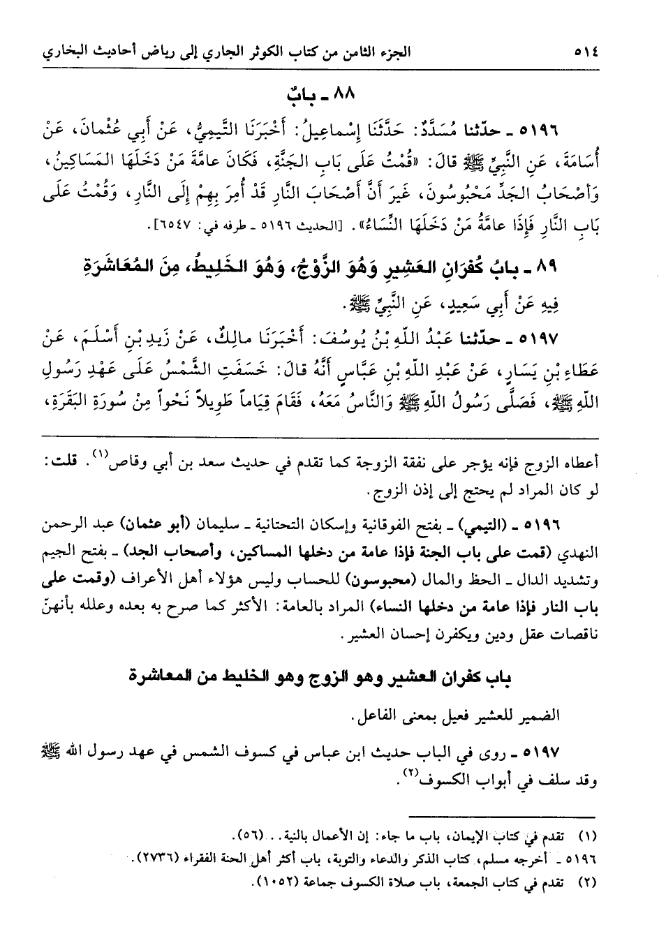 5196 - (التيمي) -بفتح الفوقانية وإسكان التحتانية- سليمان (أبو عثمان) عبد الرحمن النهدي (قمت على باب الجنة فإذا عامة من دخلها المساكين، وأصحاب الجد) -بفتح الجيم وتشديد الدال- الحظ والمال (محبوسون) للحساب وليس هؤلاء أهل الأعراف (وقمت على باب النار فإذا عامة من دخلها النساء) المراد بالعامة: الأكثر كما صرح به بعده وعلله بأنهنّ ناقصات عقل ودين ويكفرن إحسان العشير.