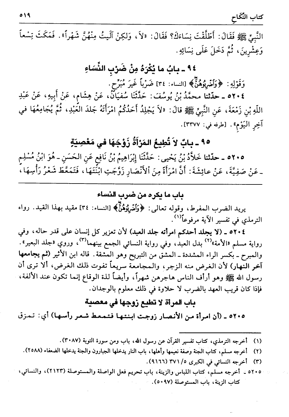 5204 - (لا يجلد أحدكم امرأته جلد العبد) لأن تعزير كل إنسان على قدر حاله، وفي رواية مسلم "الأمة" بدل العبد، وفي رواية النسائي الجمع بينهما، وروي "جلد البعير". والمبرح -بكسر الراء المشددة- المشق من التبريح وهو المشقة. قاله ابن الأثير (ثم يجامعها آخر النهار) لأن الغرض منه الزجر، والمجامعة سريعًا تفوت ذلك الغرض، ألا ترى أن رسول الله -صلى الله عليه وسلم- وهو أرأف الناس هاجرهن شهرًا، وأيضًا لذة الوقاع إنما تكون عند الألفة، فإذا كان قريب العهد بالضرب لا حلاوة في ذلك معلوم بالوجدان.