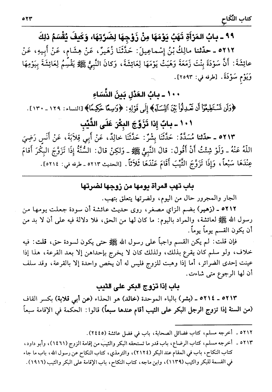 5213 - حَدَّثَنَا مُسَدَّدٌ حَدَّثَنَا بِشْرٌ حَدَّثَنَا خَالِدٌ عَنْ أَبِى قِلاَبَةَ عَنْ أَنَسٍ - رضى الله عنه - وَلَوْ شِئْتُ أَنْ أَقُولَ قَالَ النَّبِىُّ - صلى الله عليه وسلم - وَلَكِنْ قَالَ السُّنَّةُ إِذَا تَزَوَّجَ الْبِكْرَ أَقَامَ عِنْدَهَا سَبْعًا، وَإِذَا تَزَوَّجَ الثَّيِّبَ أَقَامَ عِنْدَهَا ثَلاَثًا. طرفه 5214
