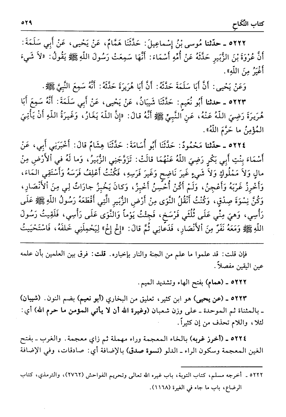 5223 - (عن يحيى) هو ابن كثير، تعليق من البخاري (أبو نعيم) بضم النون. (شيبان) -بالمثناة ثم الموحدة- على وزن شعبان (وغيرة الله أن لا يأتي المؤمن ما حرم الله) أي: لئلا، واللام تحذف من إن كثيرًا.