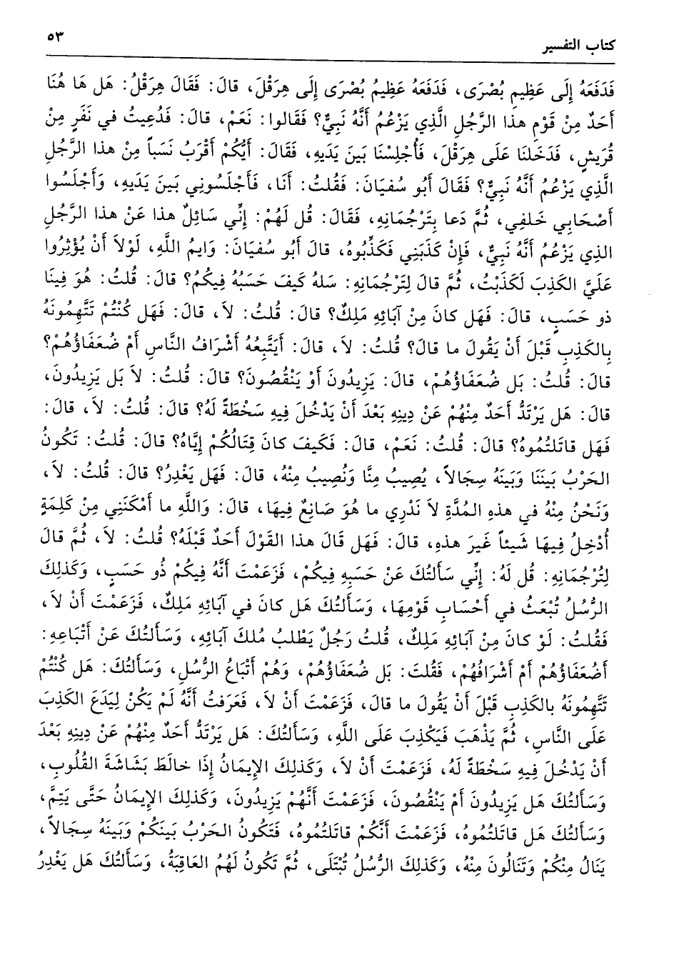 فَدَفَعَهُ إِلَى عَظِيمِ بُصْرَى، فَدَفَعَهُ عَظِيمُ بُصْرَى إِلَى - هِرَقْلَ - قَالَ فَقَالَ هِرَقْلُ هَلْ هَا هُنَا أَحَدٌ مِنْ قَوْمِ هَذَا الرَّجُلِ الَّذِى يَزْعُمُ أَنَّهُ نَبِىٌّ فَقَالُوا نَعَمْ. قَالَ فَدُعِيتُ فِي نَفَرٍ مِنْ قُرَيْشٍ فَدَخَلْنَا عَلَى هِرَقْلَ، فَأُجْلِسْنَا بَيْنَ يَدَيْهِ فَقَالَ أَيُّكُمْ أَقْرَبُ نَسَبًا مِنْ هَذَا الرَّجُلِ الَّذِى يَزْعُمُ أَنَّهُ نَبِىٌّ فَقَالَ أَبُو سُفْيَانَ فَقُلْتُ أَنَا. فَأَجْلَسُونِى بَيْنَ يَدَيْهِ، وَأَجْلَسُوا أَصْحَابِى خَلْفِى، ثُمَّ دَعَا بِتُرْجُمَانِهِ فَقَالَ قُلْ لَهُمْ إِنِّى سَائِلٌ هَذَا عَنْ هَذَا الرَّجُلِ الَّذِى يَزْعُمُ أَنَّهُ نَبِىٌّ، فَإِنْ كَذَبَنِى فَكَذِّبُوهُ. قَالَ أَبُو سُفْيَانَ وَايْمُ اللَّهِ، لَوْلاَ أَنْ يُؤْثِرُوا عَلَىَّ الْكَذِبَ لَكَذَبْتُ. ثُمَّ قَالَ لِتُرْجُمَانِهِ سَلْهُ كَيْفَ حَسَبُهُ فِيكُمْ قَالَ قُلْتُ هُوَ فِينَا ذُو حَسَبٍ. قَالَ فَهَلْ كَانَ مِنْ آبَائِهِ مَلِكٌ قَالَ قُلْتُ لاَ. قَالَ فَهَلْ كُنْتُمْ تَتَّهِمُونَهُ بِالْكَذِبِ قَبْلَ أَنْ يَقُولَ مَا قَالَ قُلْتُ لاَ. قَالَ أَيَتَّبِعُهُ أَشْرَافُ النَّاسِ أَمْ ضُعَفَاؤُهُمْ قَالَ قُلْتُ بَلْ ضُعَفَاؤُهُمْ. قَالَ يَزِيدُونَ أَوْ يَنْقُصُونَ قَالَ قُلْتُ لاَ بَلْ يَزِيدُونَ. قَالَ هَلْ يَرْتَدُّ أَحَدٌ مِنْهُمْ عَنْ دِينِهِ، بَعْدَ أَنْ يَدْخُلَ فِيهِ، سَخْطَةً لَهُ قَالَ قُلْتُ لاَ.
