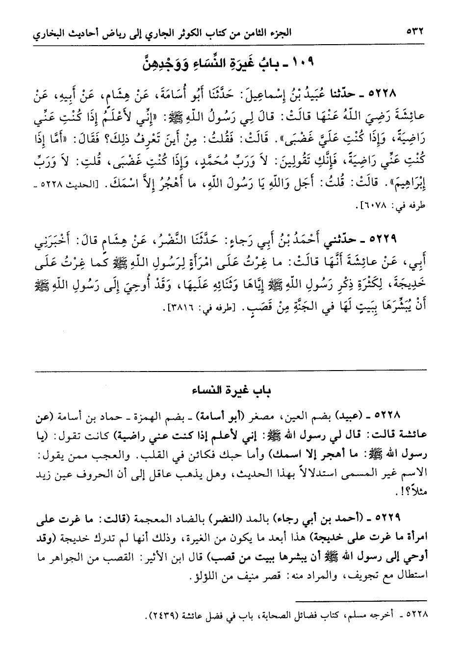 5228 - (عبيد) بضم العين، مصغر (أبو أسامة) -بضم الهمزة- حماد بن أسامة (عن عائشة قالت: قال لي رسول الله -صلى الله عليه وسلم-: إني لأعلم إذا كنت عني راضية) كانت تقول: (يا رسول الله -صلى الله عليه وسلم-: ما أهجر إلا اسمك) وأما حبك فكائن في القلب. والعجب ممن يقول: الاسم غير المسمى استدلالًا بهذا الحديث، وهل يذهب عاقل إلى أن الحروف عين زيد مثلًا؟!.