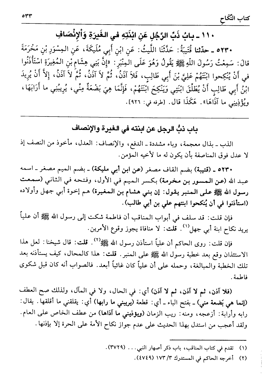 110 - باب ذَبِّ الرَّجُلِ عَنِ ابْنَتِهِ فِي الْغَيْرَةِ وَالإِنْصَافِ