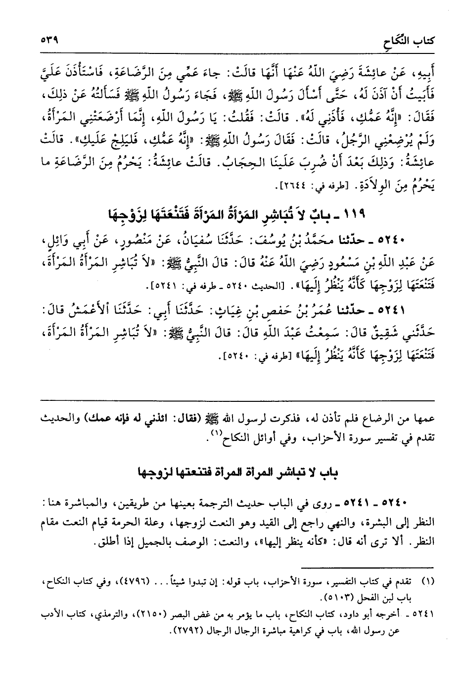 5240 - حَدَّثَنَا مُحَمَّدُ بْنُ يُوسُفَ حَدَّثَنَا سُفْيَانُ عَنْ مَنْصُورٍ عَنْ أَبِى وَائِلٍ عَنْ عَبْدِ اللَّهِ بْنِ مَسْعُودٍ - رضى الله عنه - قَالَ قَالَ النَّبِىُّ - صلى الله عليه وسلم - «لاَ تُبَاشِرِ الْمَرْأَةُ الْمَرْأَةَ فَتَنْعَتَهَا لِزَوْجِهَا، كَأَنَّهُ يَنْظُرُ إِلَيْهَا». طرفه 5241