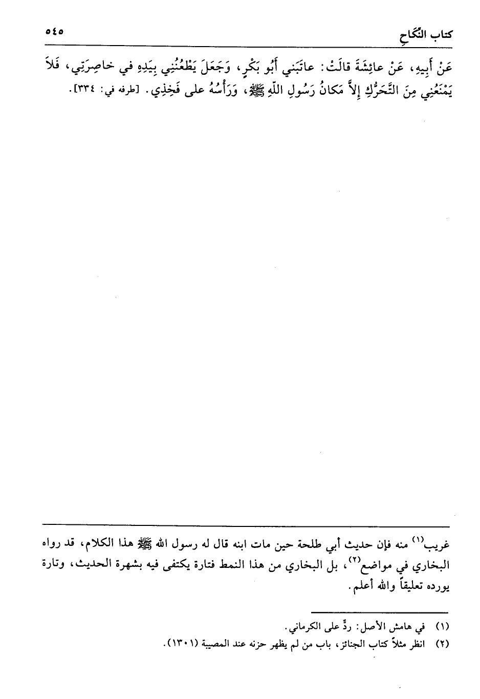 عَنْ أَبِيهِ عَنْ عَائِشَةَ قَالَتْ عَاتَبَنِى أَبُو بَكْرٍ وَجَعَلَ يَطْعُنُنِى بِيَدِهِ فِي خَاصِرَتِى فَلاَ يَمْنَعُنِى مِنَ التَّحَرُّكِ إِلاَّ مَكَانُ رَسُولِ اللَّهِ - صلى الله عليه وسلم - وَرَأْسُهُ عَلَى فَخِذِى. طرفه 334