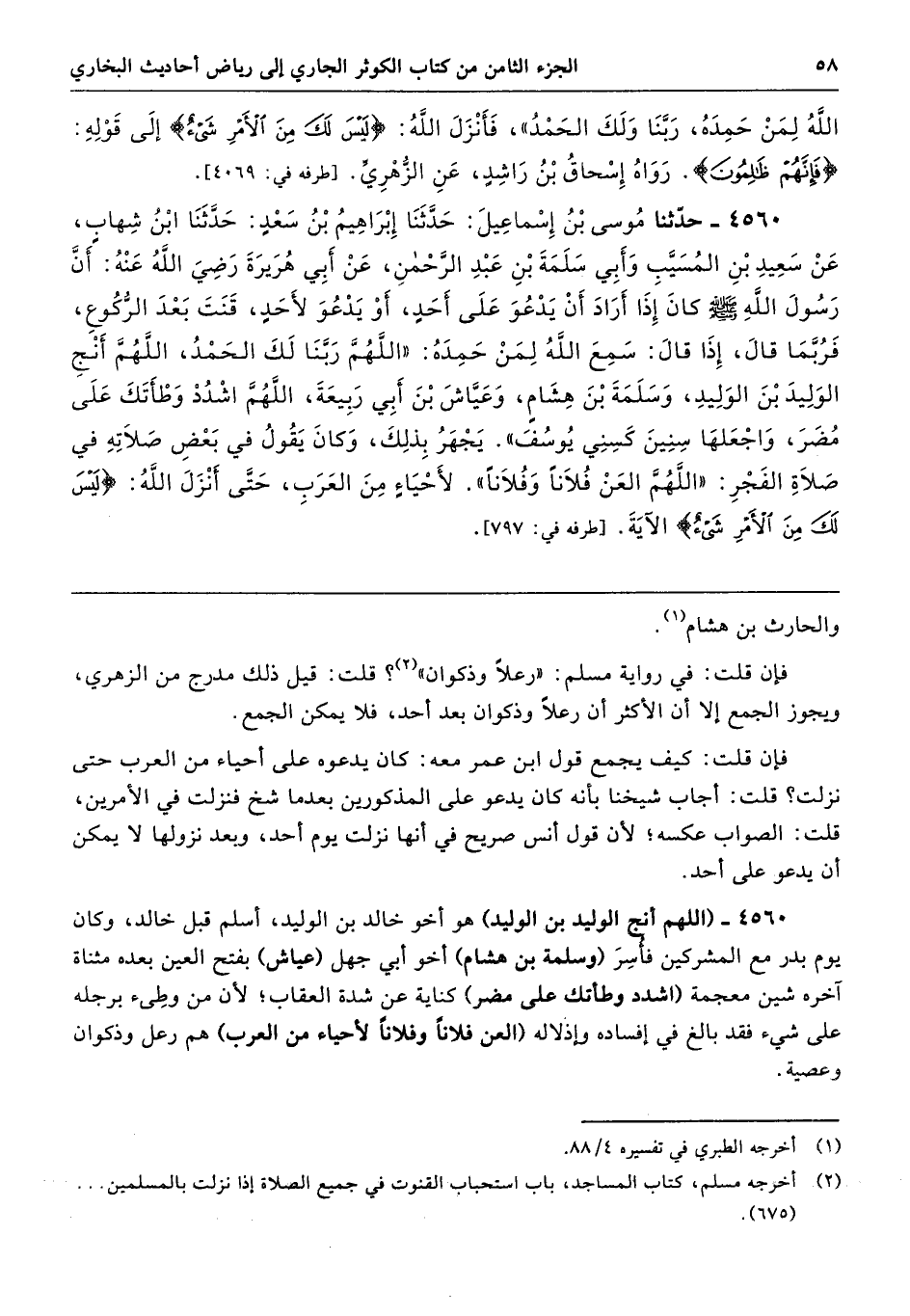 4560 - (اللهم أنج الوليد بن الوليد) هو أخو خالد بن الوليد، أسلم قبل خالد، وكان يوم بدر مع المشركين فأسِرَ (وسلمة بن هشام) أخو أبي جهل (عياش) بفتح العين بعده مثناة آخره شين معجمة (اشدد وطأتك على مضر) كناية عن شدة العقاب؛ لأن من وطِئ برجله على شيء فقد بالغ في إفساده وإذلاله (العن فلانًا وفلانًا لأحياء من العرب) هم رعل وذكوان وعصية.