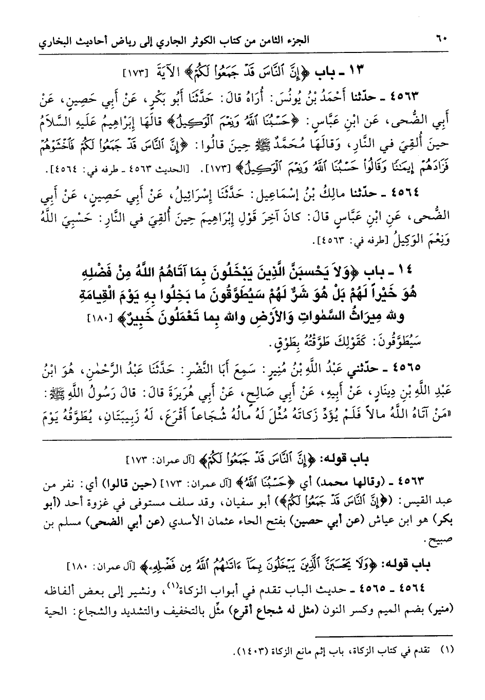 4563 - (وقالها محمد) أي {حَسْبُنَا اللَّهُ} [آل عمران: 173] (حين قالوا) أي: نفر من عبد القيس: ({إِنَّ النَّاسَ قَدْ جَمَعُوا لَكُمْ}) أبو سفيان، وقد سلف مستوفى في غزوة أحد (أبو بكر) هو ابن عياش (عن أبي حصين) بفتح الحاء عثمان الأسدي (عن أبي الضحى) مسلم بن صبيح.