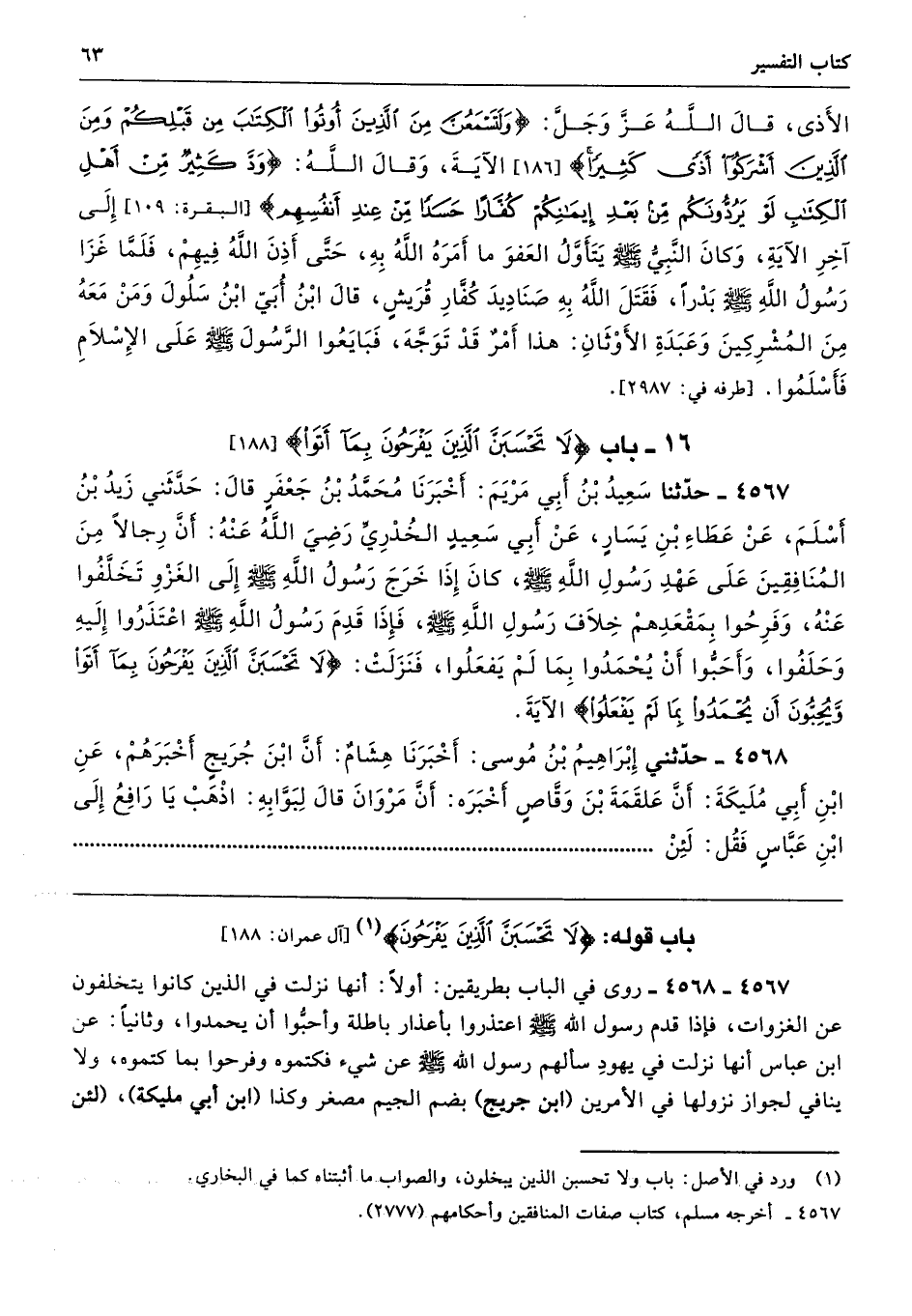 4567 - 4568 - روى في الباب بطريقين: أولًا: أنها نزلت في الذين كانوا يتخلفون عن الغزوات، فإذا قدم رسول الله - صلى الله عليه وسلم - اعتذروا بأعذار باطلة وأحبُّوا أن يحمدوا، وثانيًا: عن ابن عباس أنها نزلت في يهودٍ سألهم رسول الله - صلى الله عليه وسلم - عن شيء فكتموه وفرحوا بما كتموه، ولا ينافي لجواز نزولها في الأمرين (ابن جريج) بضم الجيم مصغر وكذا (ابن أبي مليكة)، (لئن