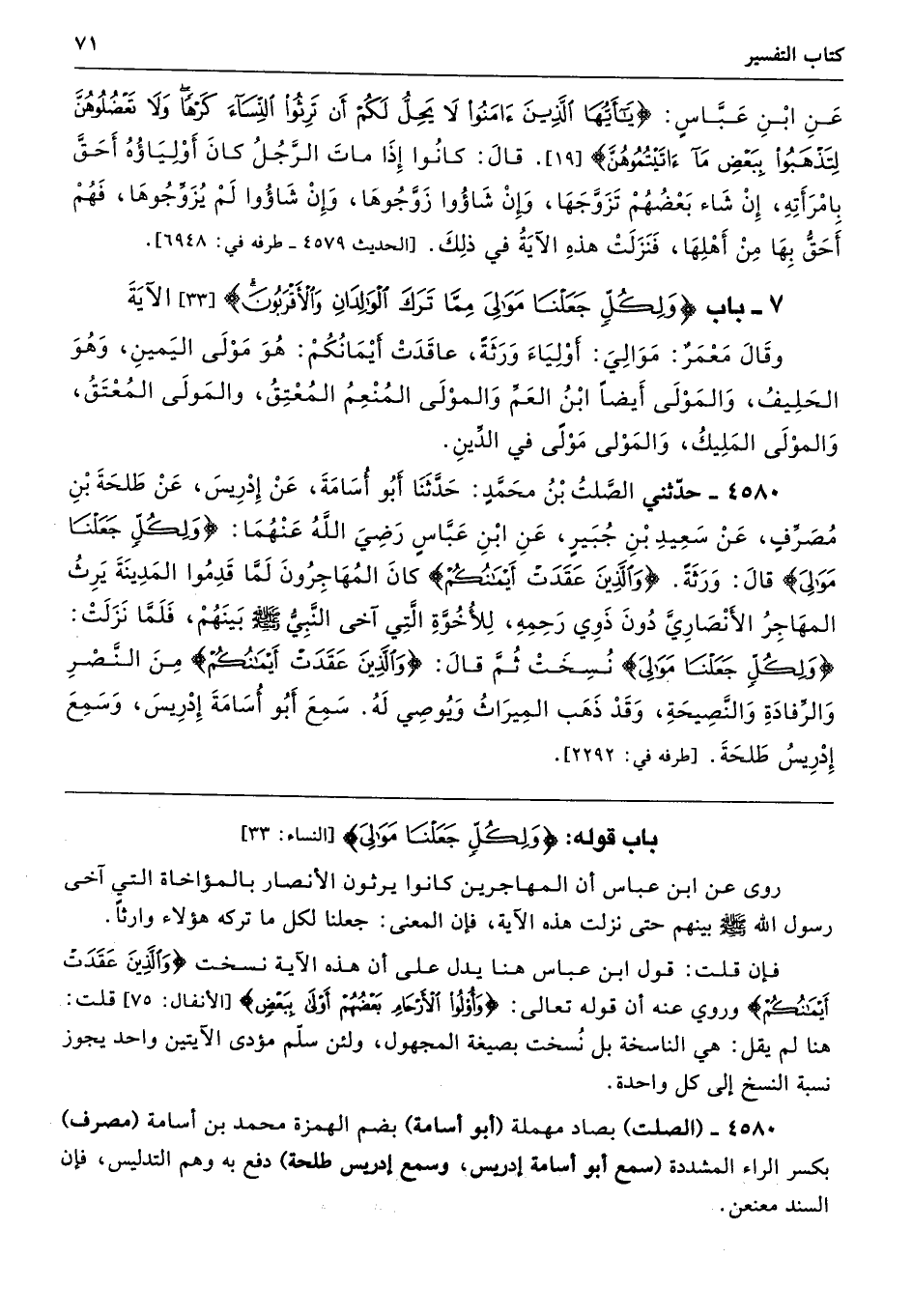 4580 - حَدَّثَنِى الصَّلْتُ بْنُ مُحَمَّدٍ حَدَّثَنَا أَبُو أُسَامَةَ عَنْ إِدْرِيسَ عَنْ طَلْحَةَ بْنِ مُصَرِّفٍ عَنْ سَعِيدِ بْنِ جُبَيْرٍ عَنِ ابْنِ عَبَّاسٍ - رضى الله عنهما - (وَلِكُلٍّ جَعَلْنَا مَوَالِىَ) قَالَ وَرَثَةً. (وَالَّذِينَ عَاقَدَتْ أَيْمَانُكُمْ) كَانَ الْمُهَاجِرُونَ لَمَّا قَدِمُوا الْمَدِينَةَ يَرِثُ الْمُهَاجِرُ الأَنْصَارِىَّ دُونَ ذَوِى رَحِمِهِ لِلأُخُوَّةِ الَّتِى آخَى النَّبِىُّ - صلى الله عليه وسلم - بَيْنَهُمْ فَلَمَّا نَزَلَتْ (وَلِكُلٍّ جَعَلْنَا مَوَالِىَ) نُسِخَتْ، ثُمَّ قَالَ (وَالَّذِينَ عَاقَدَتْ أَيْمَانُكُمْ) مِنَ النَّصْرِ، وَالرِّفَادَةِ وَالنَّصِيحَةِ، وَقَدْ ذَهَبَ الْمِيرَاثُ وَيُوصِى لَهُ. سَمِعَ أَبُو أُسَامَةَ إِدْرِيسَ، وَسَمِعَ إِدْرِيسُ طَلْحَةَ. طرفه 2292