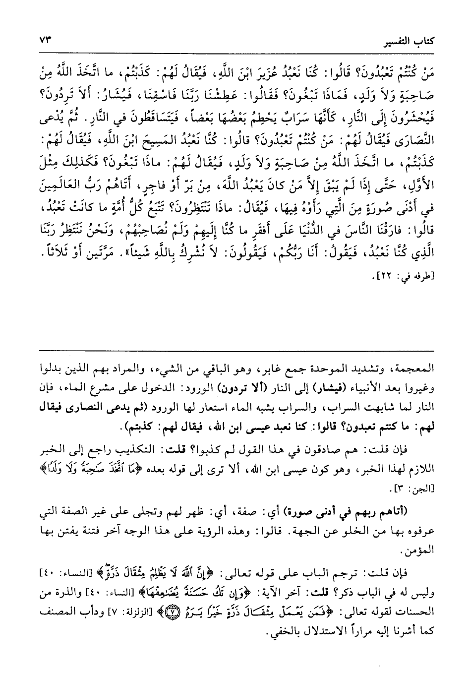 مَنْ كُنْتُمْ تَعْبُدُونَ قَالُوا كُنَّا نَعْبُدُ عُزَيْرَ ابْنَ اللَّهِ. فَيُقَالُ لَهُمْ كَذَبْتُمْ، مَا اتَّخَذَ اللَّهُ مِنْ صَاحِبَةٍ وَلاَ وَلَدٍ، فَمَاذَا تَبْغُونَ فَقَالُوا عَطِشْنَا رَبَّنَا فَاسْقِنَا. فَيُشَارُ أَلاَ تَرِدُونَ، فَيُحْشَرُونَ إِلَى النَّارِ كَأَنَّهَا سَرَابٌ، يَحْطِمُ بَعْضُهَا بَعْضًا فَيَتَسَاقَطُونَ فِي النَّارِ، ثُمَّ يُدْعَى النَّصَارَى، فَيُقَالُ لَهُمْ مَنْ كُنْتُمْ تَعْبُدُونَ قَالُوا كُنَّا نَعْبُدُ الْمَسِيحَ ابْنَ اللَّهِ. فَيُقَالُ لَهُمْ كَذَبْتُمْ، مَا اتَّخَذَ اللَّهُ مِنْ صَاحِبَةٍ وَلاَ وَلَدٍ. فَيُقَالُ لَهُمْ مَاذَا تَبْغُونَ فَكَذَلِكَ مِثْلَ الأَوَّلِ، حَتَّى إِذَا لَمْ يَبْقَ إِلاَّ مَنْ كَانَ يَعْبُدُ اللَّهَ مِنْ بَرٍّ أَوْ فَاجِرٍ، أَتَاهُمْ رَبُّ الْعَالَمِينَ فِي أَدْنَى صُورَةٍ مِنَ الَّتِى رَأَوْهُ فِيهَا، فَيُقَالُ مَاذَا تَنْتَظِرُونَ تَتْبَعُ كُلُّ أُمَّةٍ مَا كَانَتْ تَعْبُدُ. قَالُوا فَارَقْنَا النَّاسَ فِي الدُّنْيَا عَلَى أَفْقَرِ مَا كُنَّا إِلَيْهِمْ، وَلَمْ نُصَاحِبْهُمْ، وَنَحْنُ نَنْتَظِرُ رَبَّنَا الَّذِى كُنَّا نَعْبُدُ. فَيَقُولُ أَنَا رَبُّكُمْ، فَيَقُولُونَ لاَ نُشْرِكُ بِاللَّهِ شَيْئًا. مَرَّتَيْنِ أَوْ ثَلاَثًا». طرفه 22
