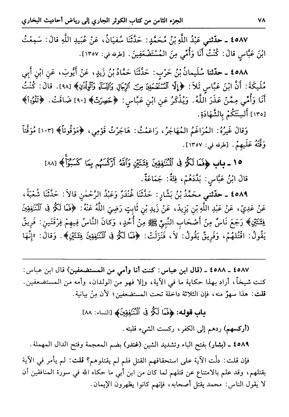 4587 - 4588 - (قال ابن عباس: كنت أنا وأمي من المستضعفبن) قال ابن عباس: كنت شيخًا، أراد بهذا حكاية ما في الآية، وإلا فهو من الولدان، وأمه من المستضعفين. قلت: هذا سهوٌ منه، فإن الثلاثة داخلة تحت المستضعفين؛ لأن مِنْ بيانية.