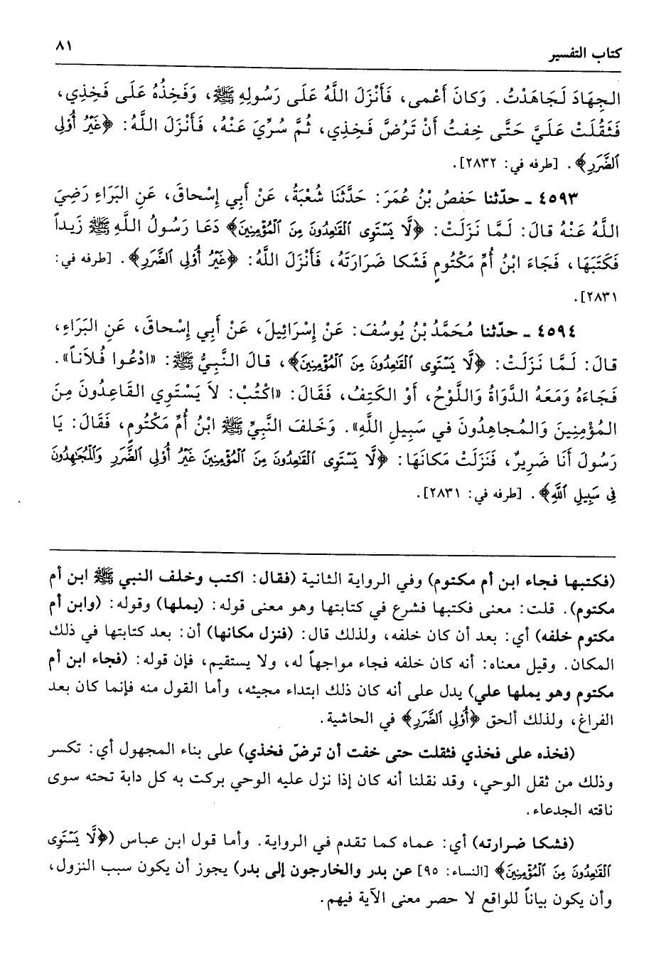 4593 - حَدَّثَنَا حَفْصُ بْنُ عُمَرَ حَدَّثَنَا شُعْبَةُ عَنْ أَبِى إِسْحَاقَ عَنِ الْبَرَاءِ - رضى الله عنه - قَالَ لَمَّا نَزَلَتْ (لاَ يَسْتَوِى الْقَاعِدُونَ مِنَ الْمُؤْمِنِينَ) دَعَا رَسُولُ اللَّهِ - صلى الله عليه وسلم - زَيْدًا فَكَتَبَهَا، فَجَاءَ ابْنُ أُمِّ مَكْتُومٍ فَشَكَا ضَرَارَتَهُ، فَأَنْزَلَ اللَّهُ (غَيْرَ أُولِى الضَّرَرِ). طرفه 2831