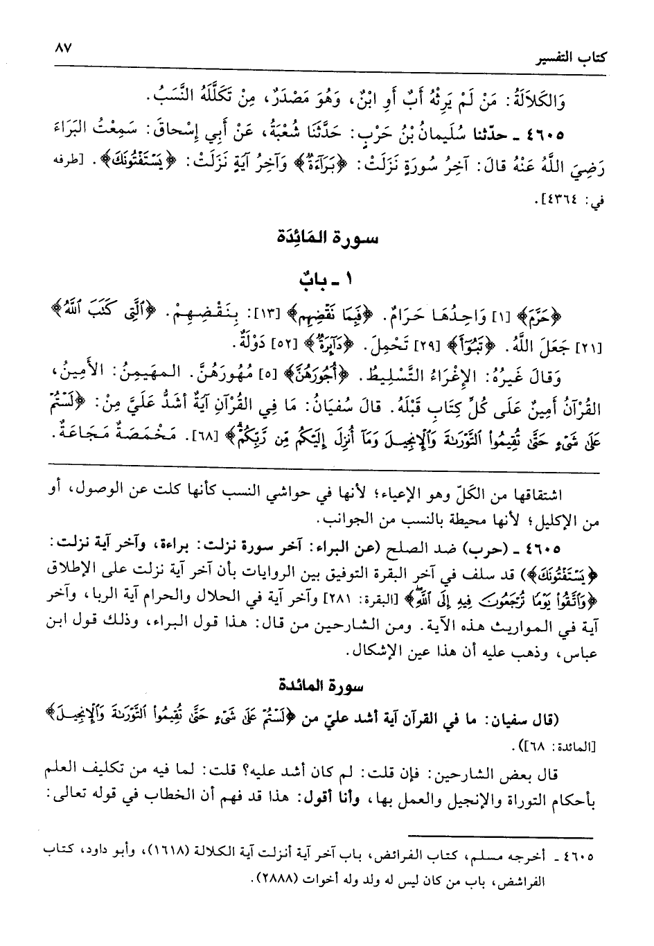 {حُرُمٌ} [البقرة: 173]: «وَاحِدُهَا حَرَامٌ». {فَبِمَا نَقْضِهِمْ} [النساء: 155]: «بِنَقْضِهِمْ». {الَّتِي كَتَبَ اللَّهُ} [المائدة: 21]: «جَعَلَ اللَّهُ». {تَبُوءُ} [المائدة: 29]: «تَحْمِلُ». {دَائِرَةٌ} [المائدة: 52]: «دَوْلَةٌ» وَقَالَ غَيْرُهُ: " الإِغْرَاءُ: التَّسْلِيطُ. {أُجُورَهُنَّ} [النساء: 24]: مُهُورَهُنَّ " قَالَ سُفْيَانُ: " مَا فِي القُرْآنِ آيَةٌ أَشَدُّ عَلَيَّ مِنْ: {لَسْتُمْ عَلَى شَيْءٍ حَتَّى تُقِيمُوا التَّوْرَاةَ وَالإِنْجِيلَ وَمَا أُنْزِلَ إِلَيْكُمْ مِنْ رَبِّكُمْ} [المائدة: 68] " وَقَالَ ابْنُ عَبَّاسٍ: {مَخْمَصَةٍ} [المائدة: 3]: «مَجَاعَةٍ»،