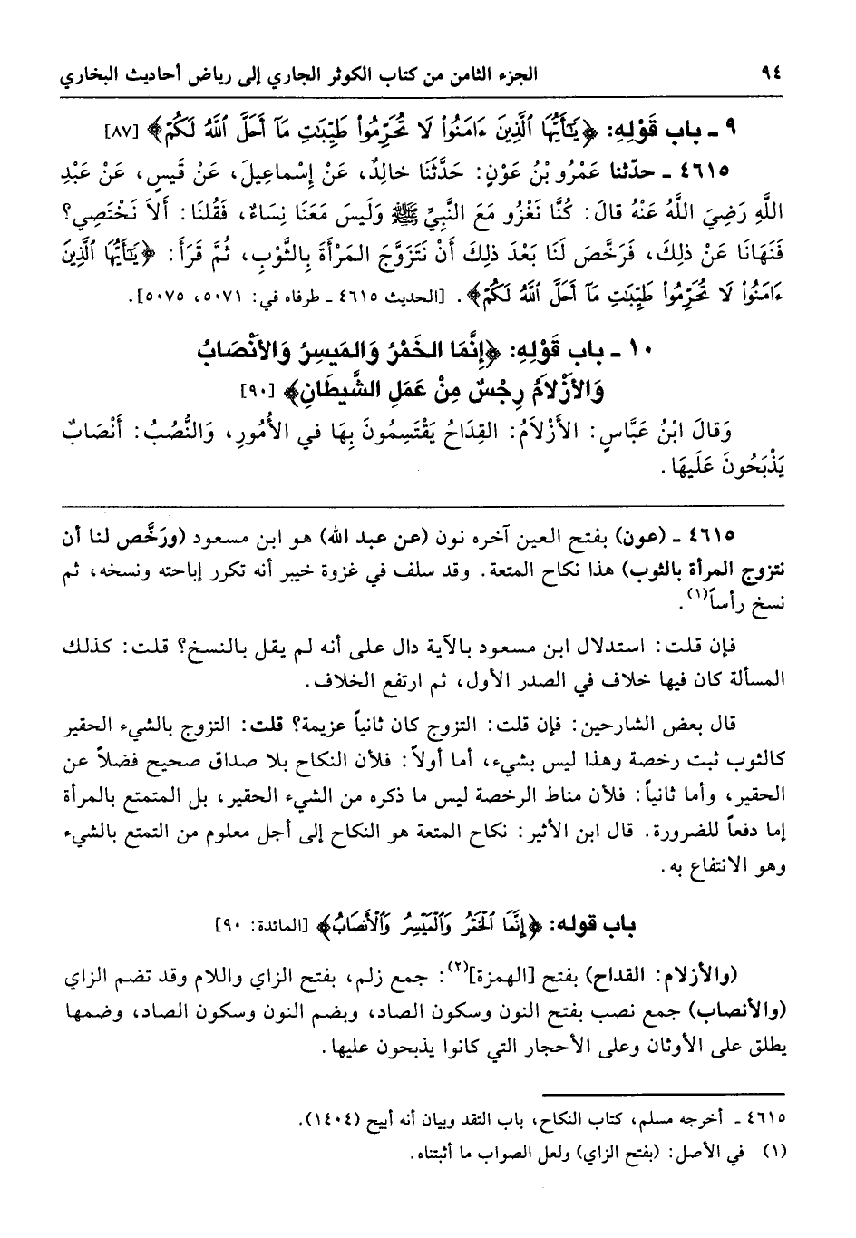 4615 - (عون) بفتح العين آخره نون (عن عبد الله) هو ابن مسعود (ورَخَّص لنا أن نتزوج المرأة بالثوب) هذا نكاح المتعة. وقد سلف في غزوة خيبر أنَّه تكرر إباحته ونسخه، ثم نسخ رأسًا.
