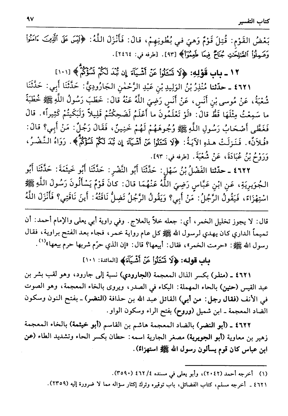 4622 - (أبو النضر) بالضاد المعجمة هاشم بن القاسم (أبو خيثمة) بالخاء المعجمة زهير بن معاوية (أبو الجويرية) مصغر الجارية اسمه: حطان بكسر الحاء وتشديد الطاء (عن ابن عباس كان قوم يسألون رسول الله - صلى الله عليه وسلم - استهزاءً).