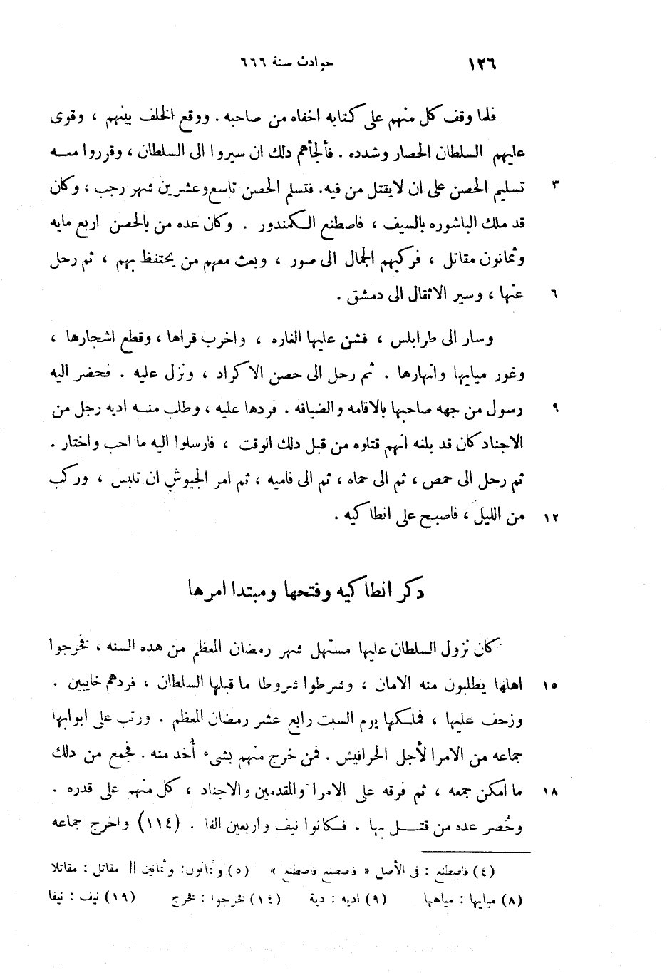 فلما وقف كل منهم على كتابه اخفاه من صاحبه. ووقع الخلف بينهم، وقوى عليهم السلطان الحصار وشدده. فألجأهم دلك أن سيروا الى السلطان، وقرروا معه تسليم الحصن على ان لا يقتل من فيه. فتسلم الحصن تاسع وعشرين شهر رجب، وكان قد ملك الباشوره بالسيف، فاصطنع (4) الكمندور. وكان عده من بالحصن اربع مايه وثمانون (5) مقاتل، فركبهم الجمال الى صور، وبعث معهم من يحتفظ بهم، ثم رحل عنها، وسير الاثقال الى دمشق.