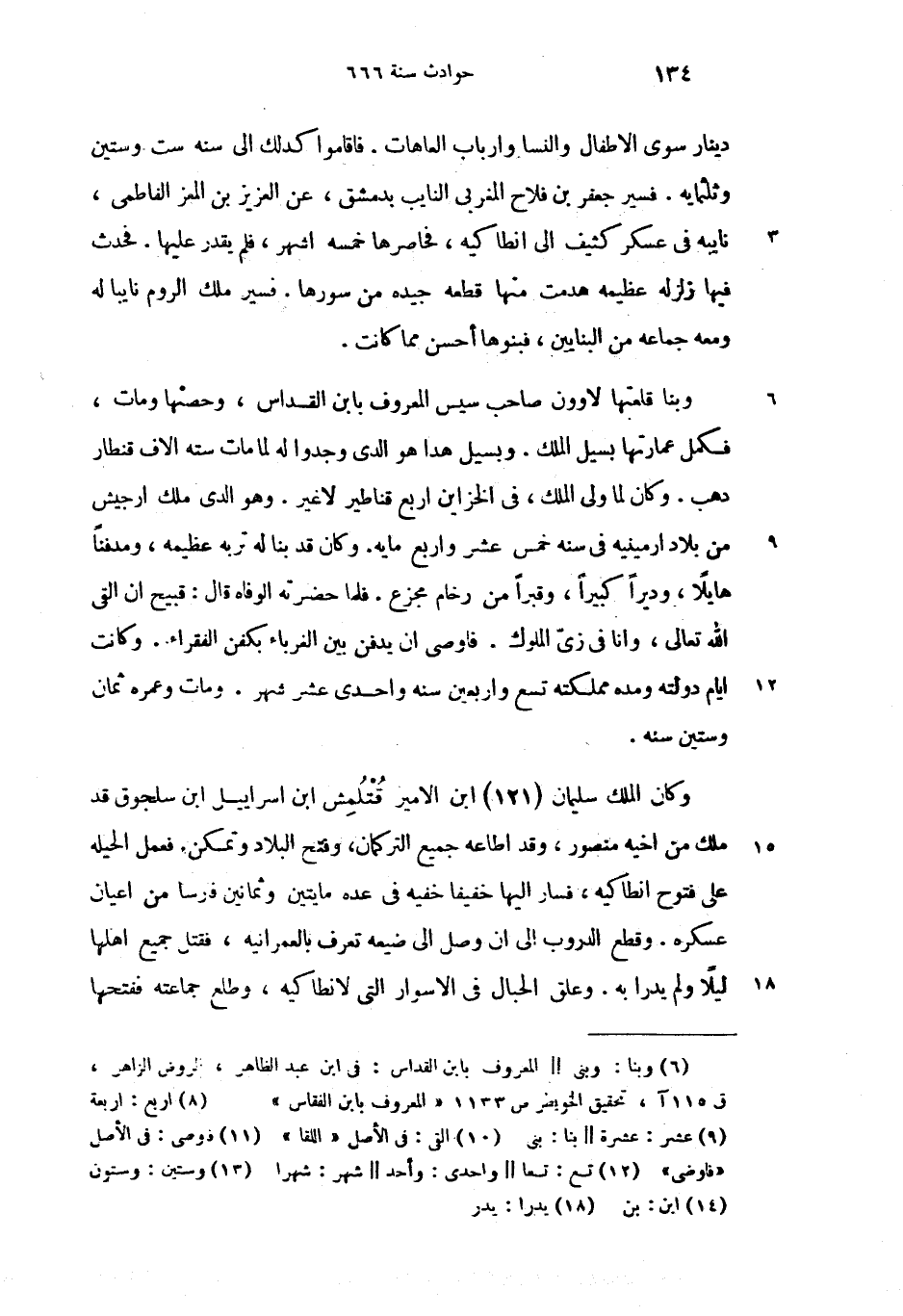 دينار سوى الاطفال والنسا وارباب العاهات. فاقاموا كدلك الى سنه ست وستين وثلثمايه. فسير جعفر بن فلاح المغربى النايب بدمشق، عن العزيز بن المعز الفاطمى، نايبه فى عسكر كثيف الى انطاكيه، فحاصرها خمسه اشهر، فلم يقدر عليها. فحدث فيها زلزله عظيمه هدمت منها قطعه جيده من سورها. فسير ملك الروم نايبا له ومعه جماعه من البنايين، فبنوها أحسن مما كانت.