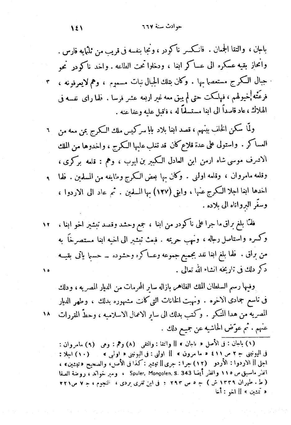 (12) جرا: جرى--تبشير: كذا فى الأصل، والصحيح «تبشين»، انظر ما سبق ص 115 وانظر أيضا، Spuler,Mongolen,S .343 ومير خواند، روضة الصفا (ط. طهران 1339 ش) ج 5 ص 293؛ فى ابن تغرى بردى، النجوم، ج 7 ص 221 «تمشين» --اخو: أخا