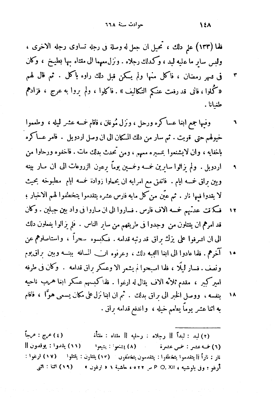 وفيها جمع ابغا عساكره ورحل، ونزل موغان، فاقام خمسه عشر (6) ليله، وطعموا خيولهم حتى قويت. ثم سار من دلك المكان الى ان وصل اردويل. فامر عساكره باخفايه، وان لا يشنعوا (8) بمسيره معهم، ومن تحدث بدلك مات. فاخفوه ورحلوا من اردويل. ولم يزالوا سايرين خمسه وخمسين يوما يرعون الزروعات الى ان صار بينه وبين براق خمسه ايام. فاتفق مع امرايه ان يحملوا زوادة خمسه ايام مطبوخه بحيث لا يقدوا (11) فيها نار. ثم عيّن من كل مايه فارس عشره يتقدموا يتخطفوا لهم الاخبار؛ فكانت عدتهم خمسه الاف فارس. فساروا الى ان صاروا فى واد بين جبلين. وكان قد امرهم ان يقتلون (13) من وجدوا فى طريقهم من ساير الناس. فلم يزالوا يفعلون دلك الى ان اشرفوا على يزك براق قد رتبه قدامه. فكبسوه سحرا، واستاصلوهم عن آخرهم. فلما عادوا الى ابغا اعجبه دلك، وعرفوه ان المسافه بينه وبين براق يوم ونصف. فسار ليلا، فلما اصبحوا لم يشعر الا وعسكر براق قدامه. وكان فى طرفه امير كبير، مقدم ثلاثه الاف يقال له ارغوا (17). فلما كبسهم عسكر ابغا هرب ناحيه بنفسه، ووصل الخبر الى براق بدلك. ثم ان ابغا نزل على مكان يسمى هوّا، فاقام به اثنا (19) عشر يوما يطعم خيله، واندفع قدامه براق.
