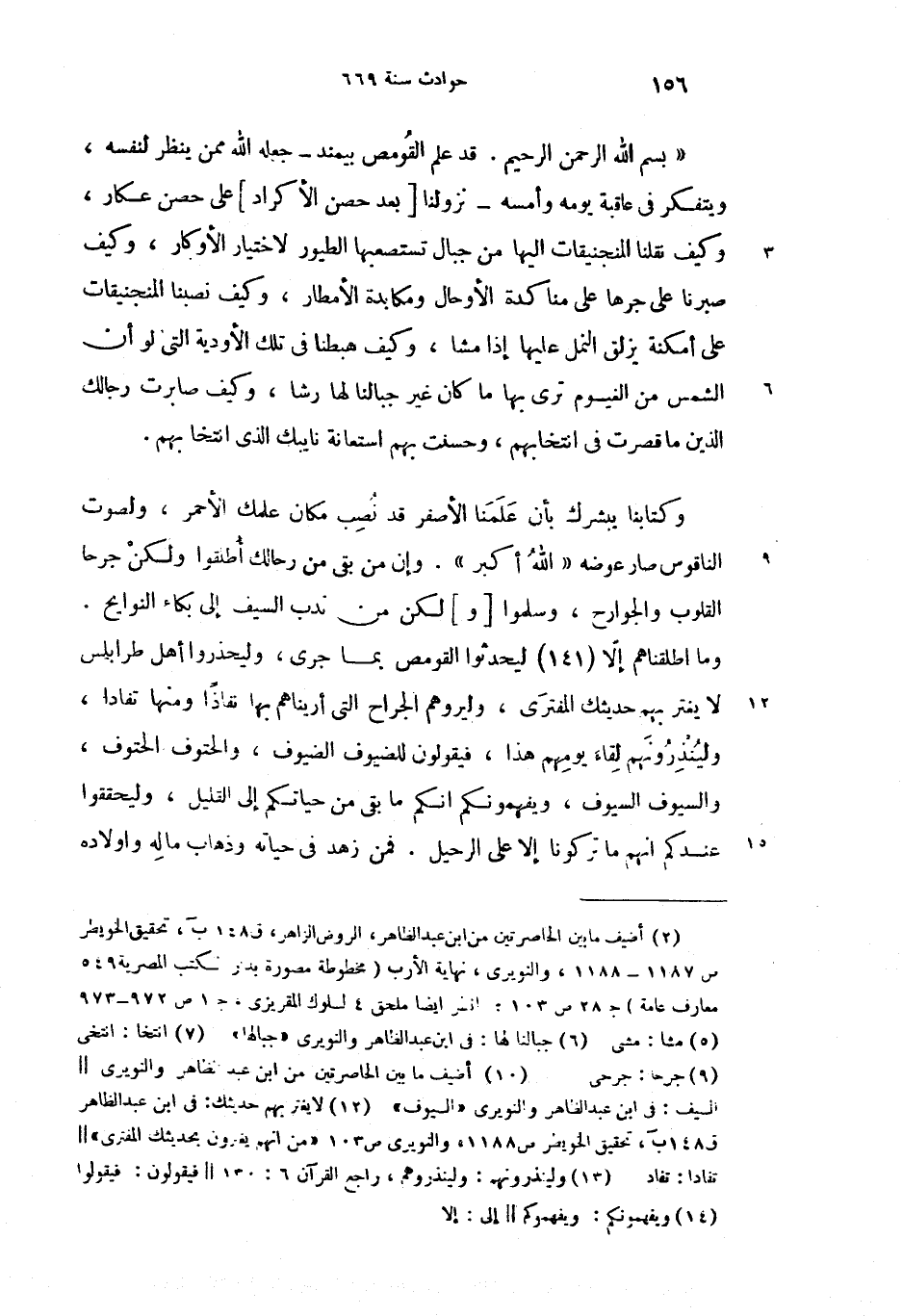 وما اطلقناهم إلاّ (141) ليحدثوا القومص بما جرى، وليحذروا أهل طرابلس لا يغتر بهم حديثك (12) المفترى، وليروهم الجراح التى أريناهم بها نفاذا ومنها تفادا، ولينذرونهم (13) لقاء يومهم هذا، فيقولون للضيوف الضيوف، والحتوف الحتوف، والسيوف السيوف، ويفهمونكم (14) انكم ما بقى من حياتكم إلى القليل، وليحققوا عندكم انهم ما تركونا إلا على الرحيل. فمن زهد فى حياته وذهاب ماله واولاده