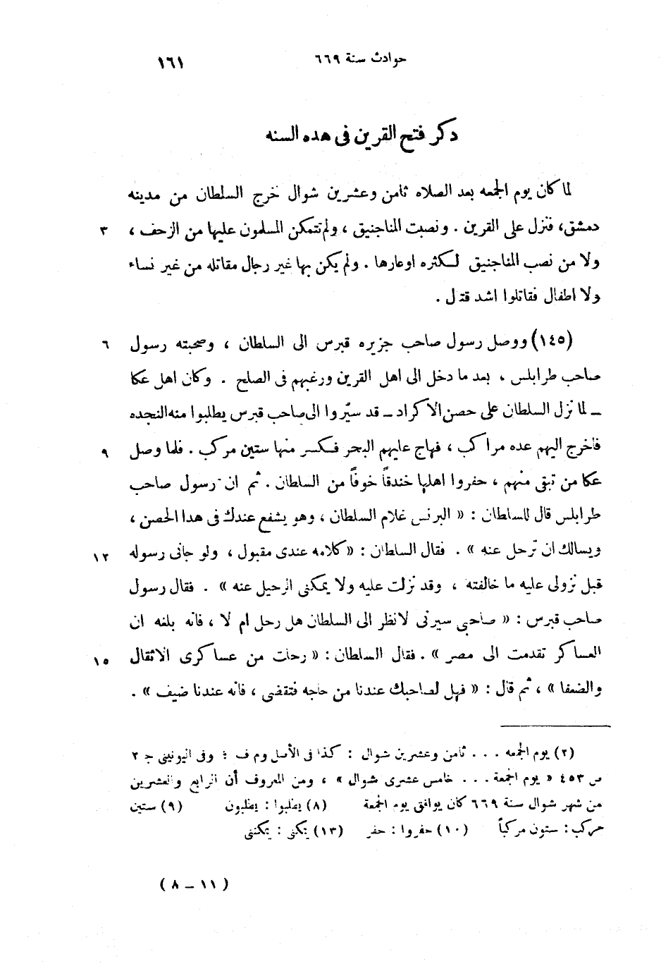 (2) يوم الجمعه. . . ثامن وعشرين شوال: كذا فى الأصل وم ف؛ وفى اليونينى ج 2 ص 453 «يوم الجمعة. . . خامس عشرى شوال»، ومن المعروف أن الرابع والعشرين من شهر شوال سنة 669 كان يوافق يوم الجمعة.