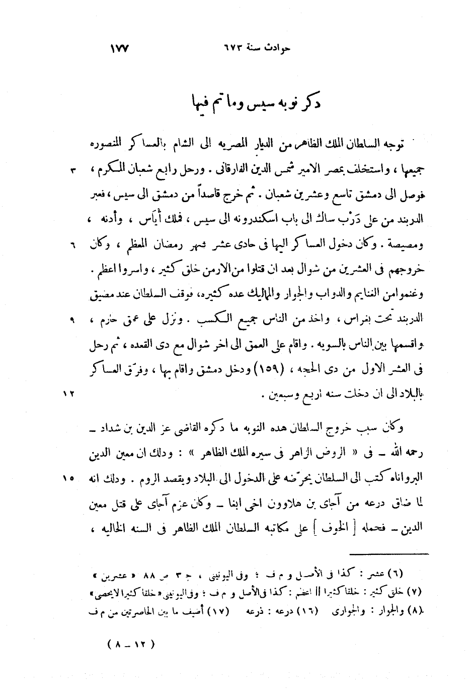 توجه السلطان الملك الظاهر من الديار المصريه الى الشام بالعساكر المنصوره جميعها، واستخلف بمصر الامير شمس الدين الفارقانى. ورحل رابع شعبان المكرم، فوصل الى دمشق تاسع وعشرين شعبان. ثم خرج قاصدا من دمشق الى سيس، فعبر الدربند من على درب ساك الى باب اسكندرونه الى سيس، فملك أياس، وأدنه، ومصيصة. وكان دخول العساكر اليها فى حادى عشر (6) شهر رمضان المعظم، وكان خروجهم فى العشرين من شوال بعد ان قتلوا من الارمن خلق كثير (7)، واسروا اعظم.