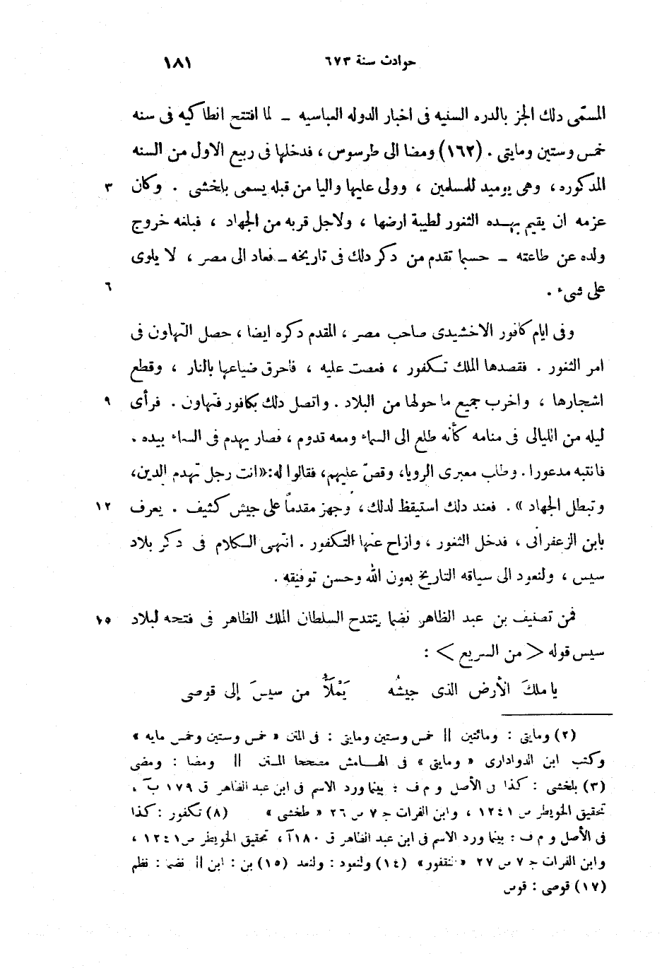 (2) ومايتى: ومائتين--خمس وستين ومايتى: فى المتن «خمس وستين وخمس مايه» وكتب ابن الدوادارى «ومايتى» فى الهامش مصححا المتن--ومضا: ومضى