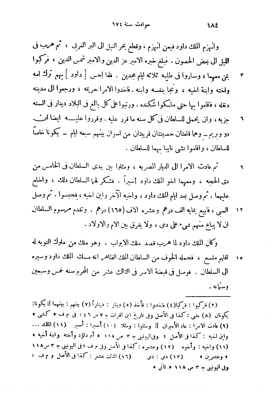 وانهزم الملك داود فيمن انهزم، وقطع بحر النيل الى البر الغربى، ثم هرب فى الليل الى بعض الحصون. فبلغ خبره الامير عز الدين والامير شمس الدين، فركبوا (2) بمن معهما، وساروا فى طلبه ثلاثه ايام مجدين. فلما احس [داود] بهم ترك امه واخته وابنة اخيه، ونجا بنفسه وابنه. فاخدوا (4) الامرا حريمه، ورجعوا الى مدينه دنقله، فاقاموا بها حتى ملكوا شكنده. ورتبوا على كل بالغ فى البلاد دينار (5) فى السنه جزيه، وان يحمل للسلطان فى كل سنه ما قرر عليه. وقرروا عليه ايضا ان دو وبريم-وهما قلعتان حصينتان قريبتان من اسوان بينهم (7) سبعه ايام-يكونا خاصا للسلطان، واقاموا بشى (8) نايبا بهما للسلطان.