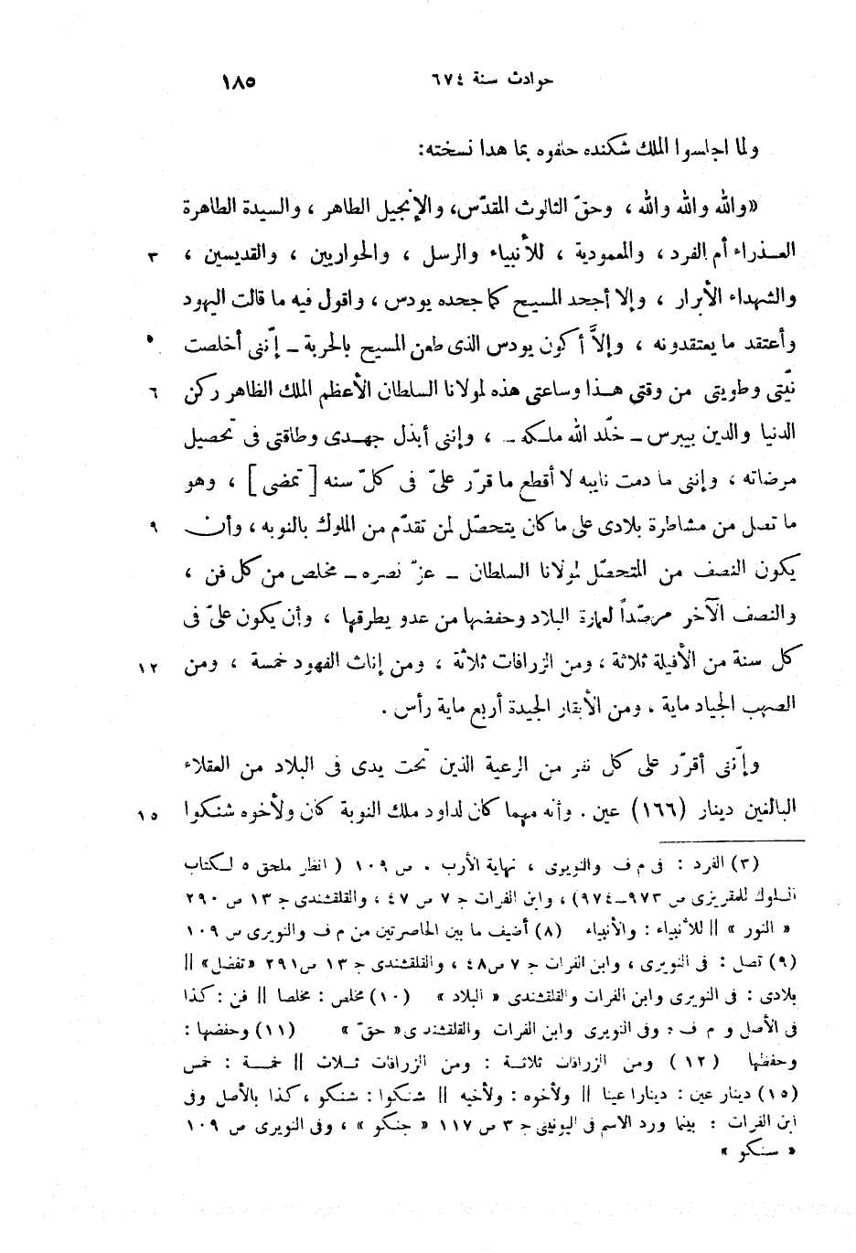 «والله والله والله، وحقّ الثالوث المقدّس، والإنجيل الطاهر، والسيدة الطاهرة العذراء أم الفرد (3)، والمعمودية، للأنبياء والرسل، والحواريين، والقديسين، والشهداء الأبرار، وإلا أجحد المسيح كما جحده يودس، واقول فيه ما قالت اليهود وأعتقد ما يعتقدونه، وإلاّ أكون يودس الذى طعن المسيح بالحربة-إنّنى أخلصت نيّتى وطويتى من وقتى هذا وساعتى هذه لمولانا السلطان الأعظم الملك الظاهر ركن الدنيا والدين بيبرس-خلّد الله ملكه-، وإننى أبذل جهدى وطاقتى فى تحصيل مرضاته، وإننى ما دمت نايبه لا أقطع ما قرّر علىّ فى كلّ سنه [تمضى] (8)، وهو ما تصل (9) من مشاطرة بلادى على ما كان يتحصّل لمن تقدّم من الملوك بالنوبه، وأن يكون النصف من المتحصّل لمولانا السلطان-عزّ نصره-مخلص (10) من كل فن، والنصف الآخر مرصّدا لعمارة البلاد وحفضها (11) من عدو يطرقها، وأن يكون علىّ فى كل سنة من الأفيلة ثلاثة، ومن الزرافات ثلاثة (12)، ومن إناث الفهود خمسة، ومن الصهب الجياد ماية، ومن الأبقار الجيدة أربع ماية رأس.