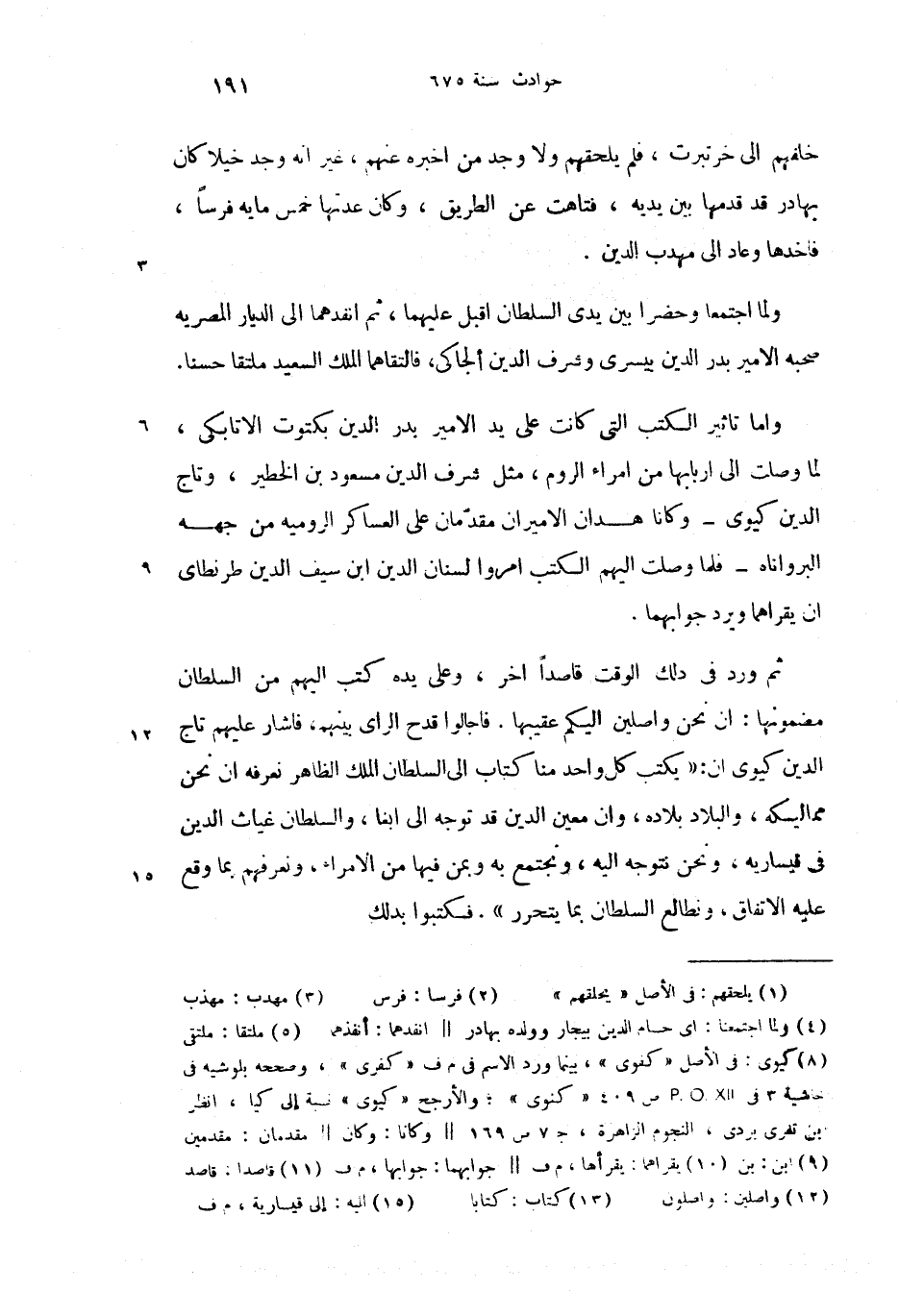 واما تاثير الكتب التى كانت على يد الامير بدر الدين بكتوت الاتابكى، لما وصلت الى اربابها من امراء الروم، مثل شرف الدين مسعود بن الخطير، وتاج الدين كيوى (8) -وكانا هذان الاميران مقدّمان على العساكر الروميه من جهه البرواناه-فلما وصلت اليهم الكتب امروا لسنان الدين ابن (9) سيف الدين طرنطاى ان يقراهما (10) ويرد جوابهما.