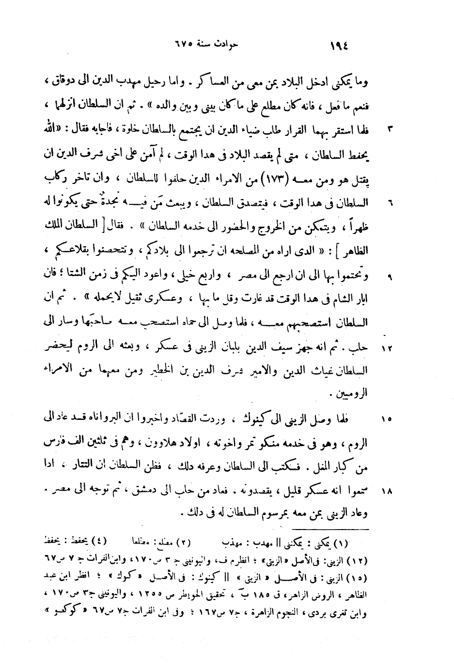 فلما وصل الزينى (15) الى كينوك، وردت القصّاد واخبروا ان البرواناه قد عاد الى الروم، وهو فى خدمه منكو تمر واخوته، اولاد هلاوون، وهم فى ثلثين الف فارس من كبار المغل. فكتب الى السلطان وعرفه دلك، فظن السلطان ان التتار، ادا سمعوا انه عسكر قليل، يقصدونه، فعاد من حلب الى دمشق، ثم توجه الى مصر.