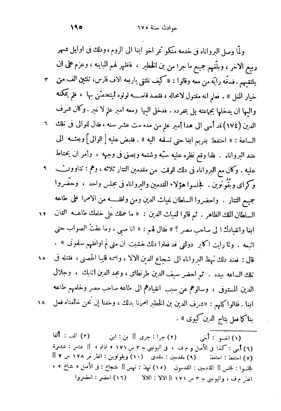 قال: فعند دلك نهظ (15) البرواناه الى شجاع الدين الالا، واسمه قايبا الحصنى، فقتله فى تلك الساعه بيده. ثم احضر (16) سيف الدين طرنطاى، ومجد الدين اتابك، وجلال الدين المستوفى، وسالوهم عن سبب انقيادهم الى طاعه صاحب مصر وخلعهم طاعه ابغا. فقالوا كلهم: «شرف الدين بن الخطير امرنا بدلك، وخففنا إن نحن خالفناه فعل بنا كما فعل بتاج الدين كيوى».