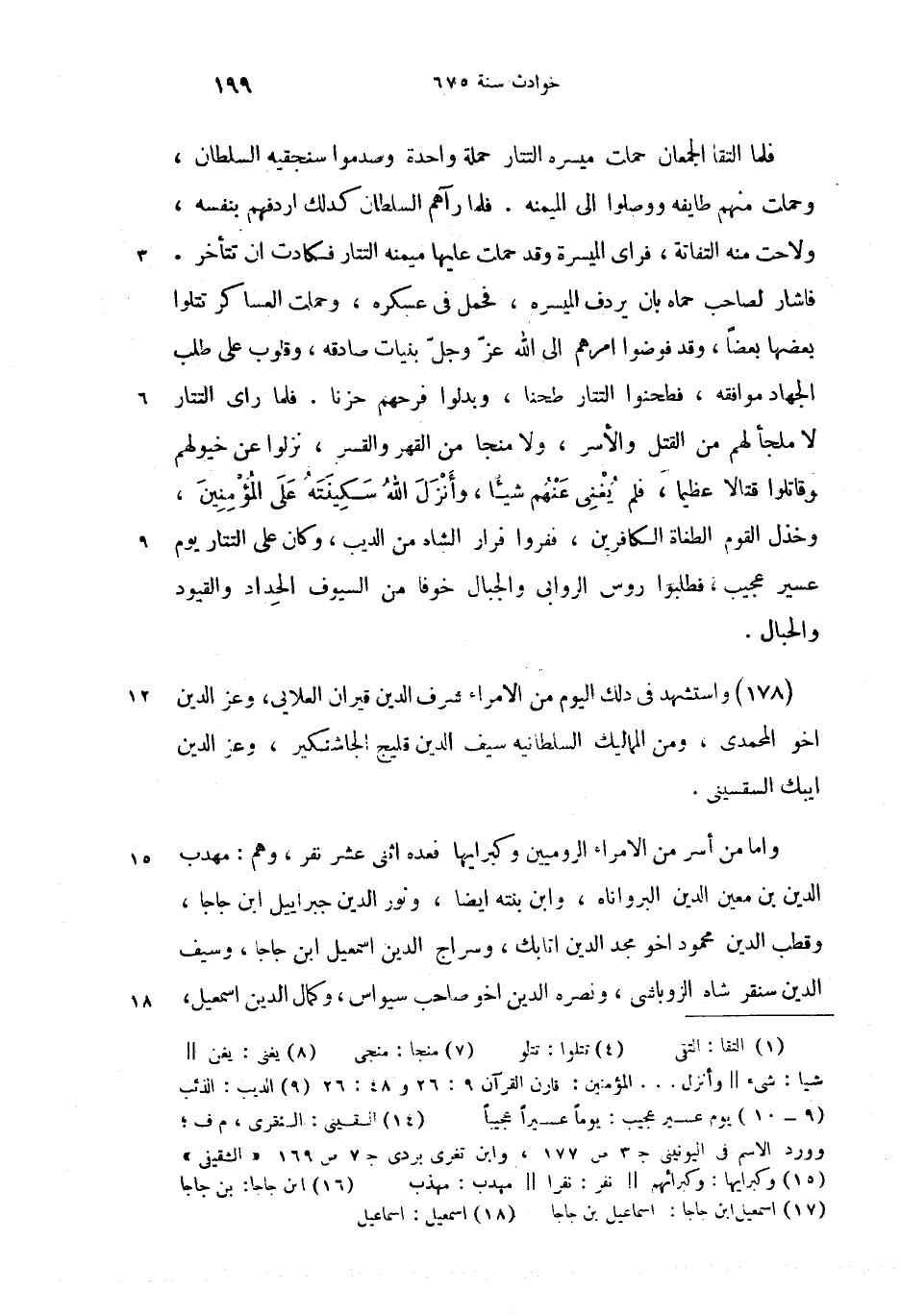 واما من أسر من الامراء الروميين وكبرايها (15) فعده اثنى عشر نفر، وهم: مهذب الدين بن معين الدين البرواناه، وابن بنته ايضا، ونور الدين جبراييل ابن جاجا (16)، وقطب الدين محمود اخو مجد الدين اتابك، وسراج الدين اسمعيل ابن جاجا (17)، وسيف الدين سنقر شاه الزوباشى، ونصره الدين اخو صاحب سيواس، وكمال الدين اسمعيل (18)،