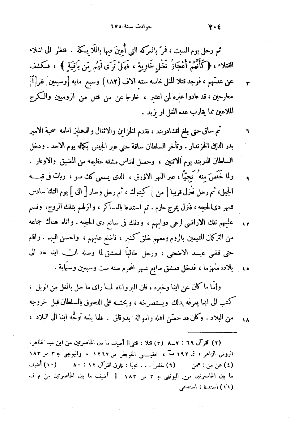 ثم رحل يوم السبت، فمرّ بالمعركه التى أعين فيها بالملايكة. فنظر الى اشلاء القتلاء، {كَأَنَّهُمْ أَعْجازُ نَخْلٍ خاوِيَةٍ، فَهَلْ تَرى لَهُمْ مِنْ باقِيَةٍ} (2)، فكشف عن عدتهم، فوجد قتلا (3) المغل خاصه سته الاف (182) وسبع مايه [وسبعين] نفر [ا] مطرحين، قد عادوا عبره لمن اعتبر، خارجا عن من (4) قتل من الروميين والكرج الملاعين مما يقارب عده المغل او يزيد.