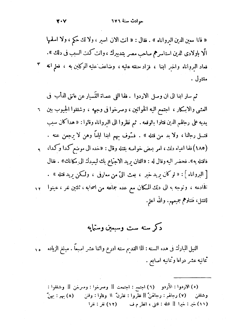 (185) فلما اعياه دلك، امر بعض خواصه بقتله وقال: «خده الى موضع كدا وكدا، فاقتله به». فحضر اليه وقال له: «القان يريد الاجتماع بك ليعيدك الى مكانك». فقال [البرواناه]: «لو كان يريد خير (11)، بعث الىّ من معارفى، ولكن يريد قتله».