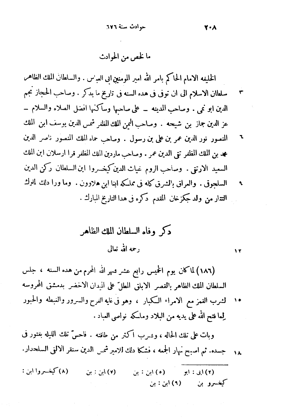 الخليفه الامام الحاكم بامر الله امير المومنين ابى (2) العباس. والسلطان الملك الظاهر سلطان الاسلام الى ان توفى فى هده السنه فى تاريخ ما يدكر. وصاحب الحجاز نجم الدين ابو نمى. وصاحب المدينه-على صاحبها وساكنها افضل الصلاه والسلام- عز الدين جماز بن شيحه. وصاحب اليمن الملك المظفر شمس الدين يوسف ابن (5) الملك المنصور نور الدين عمر بن على بن رسول. وصاحب حماه الملك المنصور ناصر الدين محمد بن الملك المظفر تقى الدين عمر. وصاحب ماردين الملك المظفر قرا ارسلان ابن (7) الملك السعيد الارتقى. وصاحب الروم غياث الدين كيخسروا ابن (8) السلطان ركن الدين السلجوقى. والعراق بالشرق كله فى مملكه ابغا ابن (9) هلاوون. وما ورا دلك لملوك التتار من ولد جكز خان المقدم دكره فى هدا التاريخ المبارك.