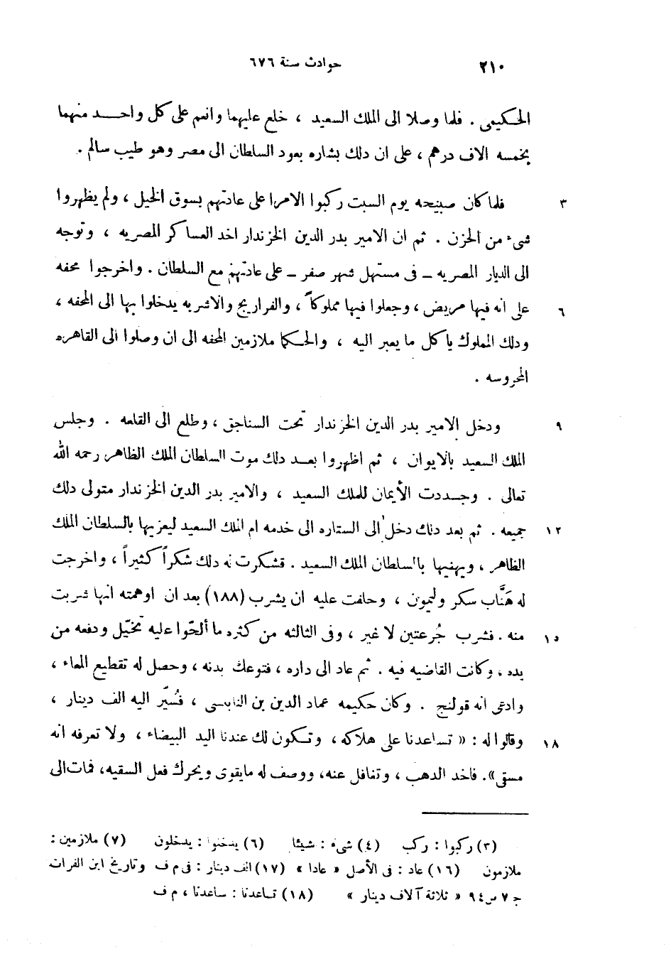 ودخل الامير بدر الدين الخزندار تحت السناجق، وطلع الى القلعه. وجلس الملك السعيد بالايوان، ثم اظهروا بعد دلك موت السلطان الملك الظاهر رحمه الله تعالى. وجددت الأيمان للملك السعيد، والامير بدر الدين الخزندار متولى دلك جميعه. ثم بعد دلك دخل الى الستاره الى خدمه ام الملك السعيد ليعزيها بالسلطان الملك الظاهر، ويهنيها بالسلطان الملك السعيد. قشكرت له دلك شكرا كثيرا، واخرجت له هنّاب سكر وليمون، وحلفت عليه ان يشرب (188) بعد ان اوهمته انها شربت منه. فشرب جرعتين لا غير، وفى الثالثه من كثره ما ألحّوا عليه تخيّل ودفعه من يده، وكانت القاضيه فيه. ثم عاد (16) الى داره، فتوعك بدنه، وحصل له تقطيع المعاء، وادعى انه قولنج. وكان حكيمه عماد الدين بن النابلسى، فسيّر اليه الف دينار (17)، وقالوا له: «تساعدنا (18) على هلاكه، وتكون لك عندنا اليد البيضاء، ولا تعرفه انه مسقى». فاخد الدهب، وتغافل عنه، ووصف له ما يقوى ويحرك فعل السقيه، فمات الى