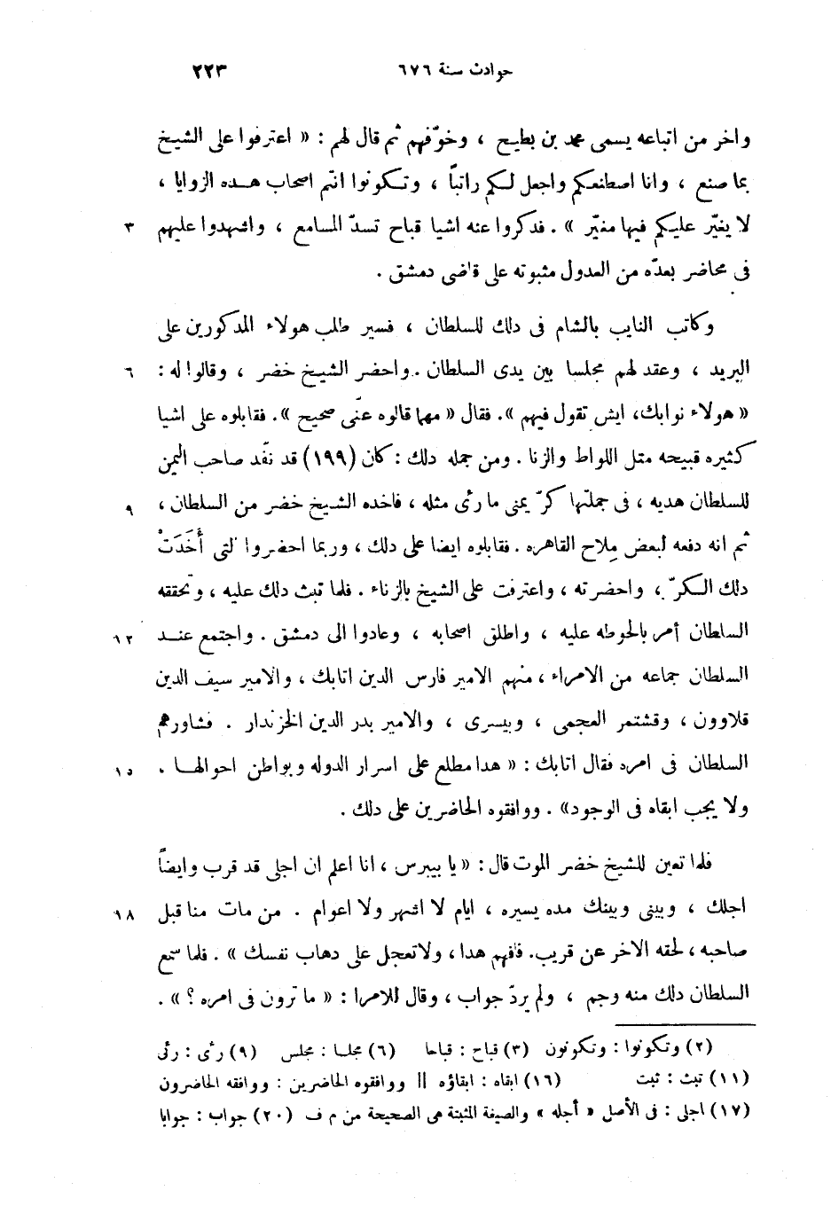 فلما تعين للشيخ خضر الموت قال: «يا بيبرس، انا اعلم ان اجلى (17) قد قرب وايضا اجلك، وبينى وبينك مده يسيره، ايام لا اشهر ولا اعوام. من مات منا قبل صاحبه، لحقه الاخر عن قريب. فافهم هدا، ولا تعجل على دهاب نفسك». فلما سمع السلطان دلك منه وجم، ولم يردّ جواب (20)، وقال للامرا: «ما ترون فى امره؟».