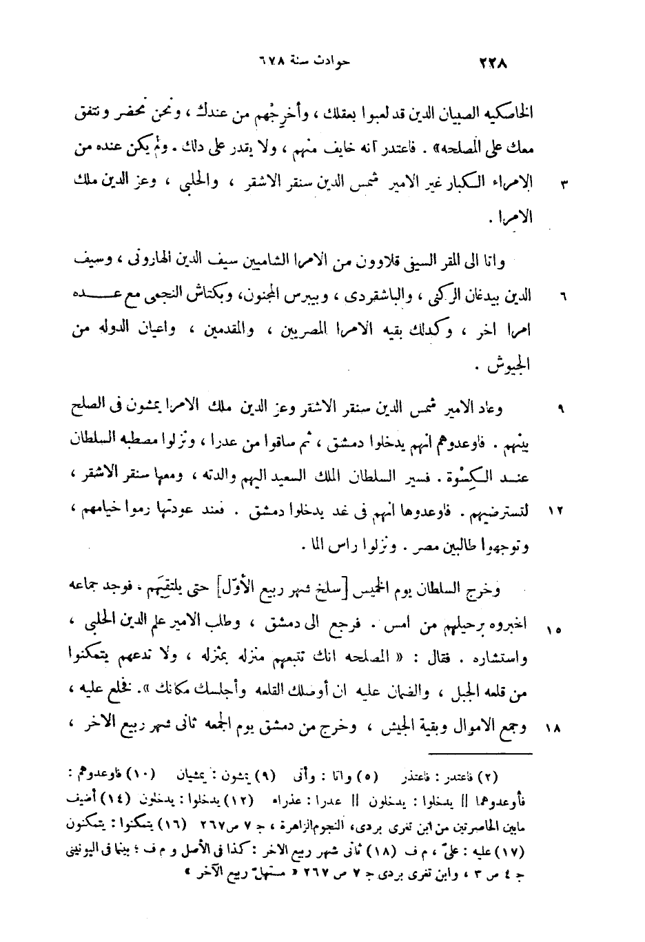 وعاد الامير شمس الدين سنقر الاشقر وعز الدين ملك الامرا يمشون (9) فى الصلح بينهم. فاوعدوهم (10) انهم يدخلوا دمشق، ثم ساقوا من عدرا، ونزلوا مصطبه السلطان عند الكسوة. فسير السلطان الملك السعيد اليهم والدته، ومعها سنقر الاشقر، لتسترضيهم. فاوعدوها انهم فى غد يدخلوا (12) دمشق. فعند عودتها رموا خيامهم، وتوجهوا طالبين مصر. ونزلوا راس الما.
