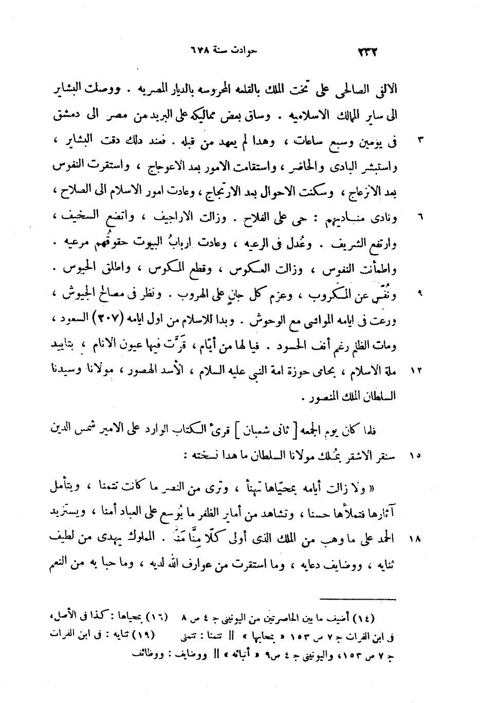ونفّس عن المكروب، وعزم كل جان على الهروب. ونظر فى مصالح الجيوش، ورعت فى ايامه المواشى مع الوحوش. وبدا للاسلام من اول ايامه (207) السعود، ومات الظلم رغم أنف الحسود. فيا لها من أيّام، قرّت فيها عيون الانام، بتاييد ملة الاسلام، بحامى حوزة امة النبى عليه السلام، الأسد الهصور، مولانا وسيدنا السلطان الملك المنصور.