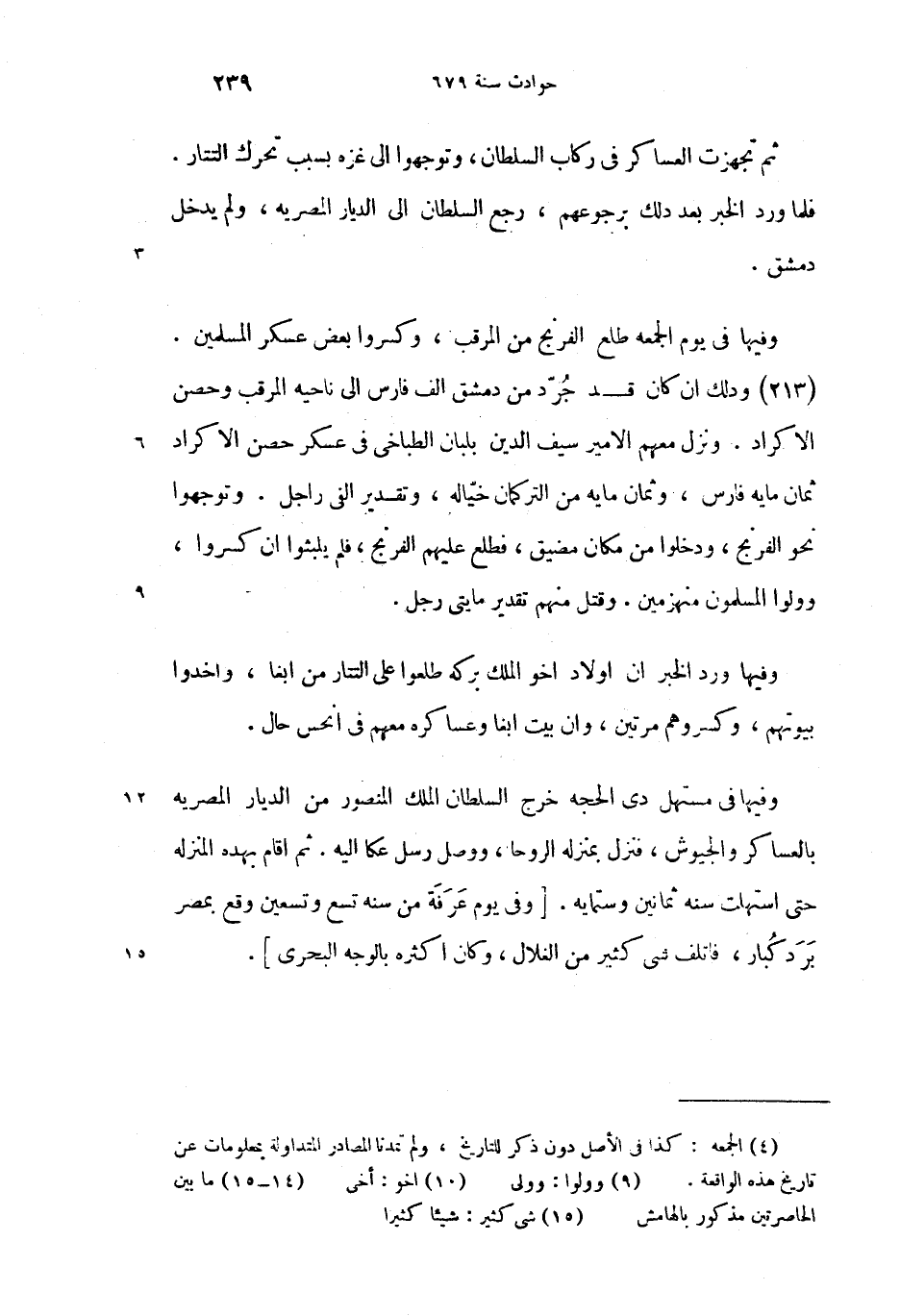 (213) وذلك ان كان قد جرّد من دمشق الف فارس الى ناحيه المرقب وحصن الاكراد. ونزل معهم الامير سيف الدين بلبان الطباخى فى عسكر حصن الاكراد ثمان مايه فارس، وثمان مايه من التركمان خيّاله، وتقدير الفى راجل. وتوجهوا نحو الفرنج، ودخلوا من مكان مضيق، فطلع عليهم الفرنج، فلم يلبثوا ان كسروا، وولوا (9) المسلمون منهزمين. وقتل منهم تقدير مايتى رجل.